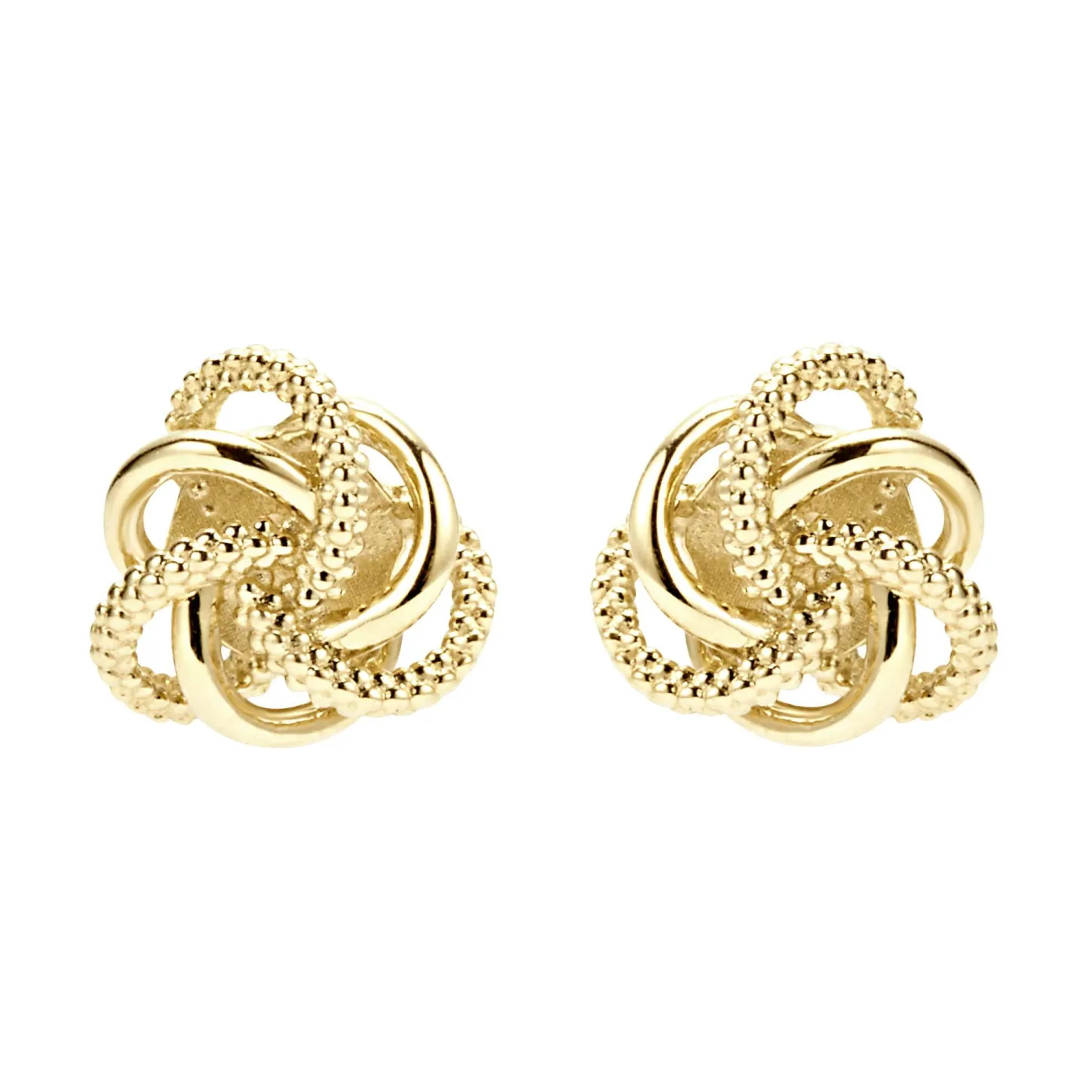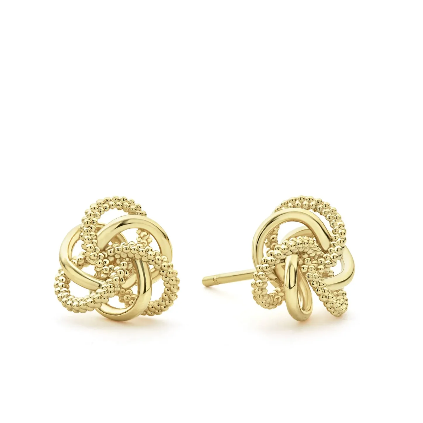 Love Knot Stud Earrings Formed Of Caviar Beaded And Highly Polished 18K Gold Bands.