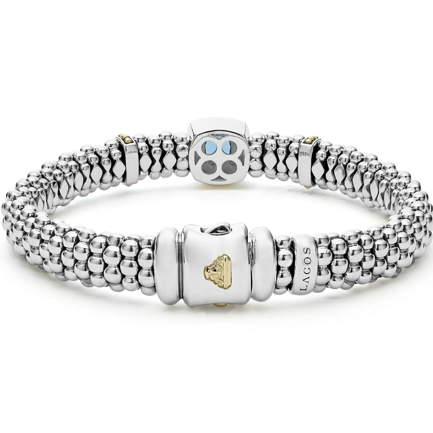 A Swiss Blue Topaz Gemstone And Sterling Silver Caviar Beading With 18K Gold Detailing Forms This Bracelet.