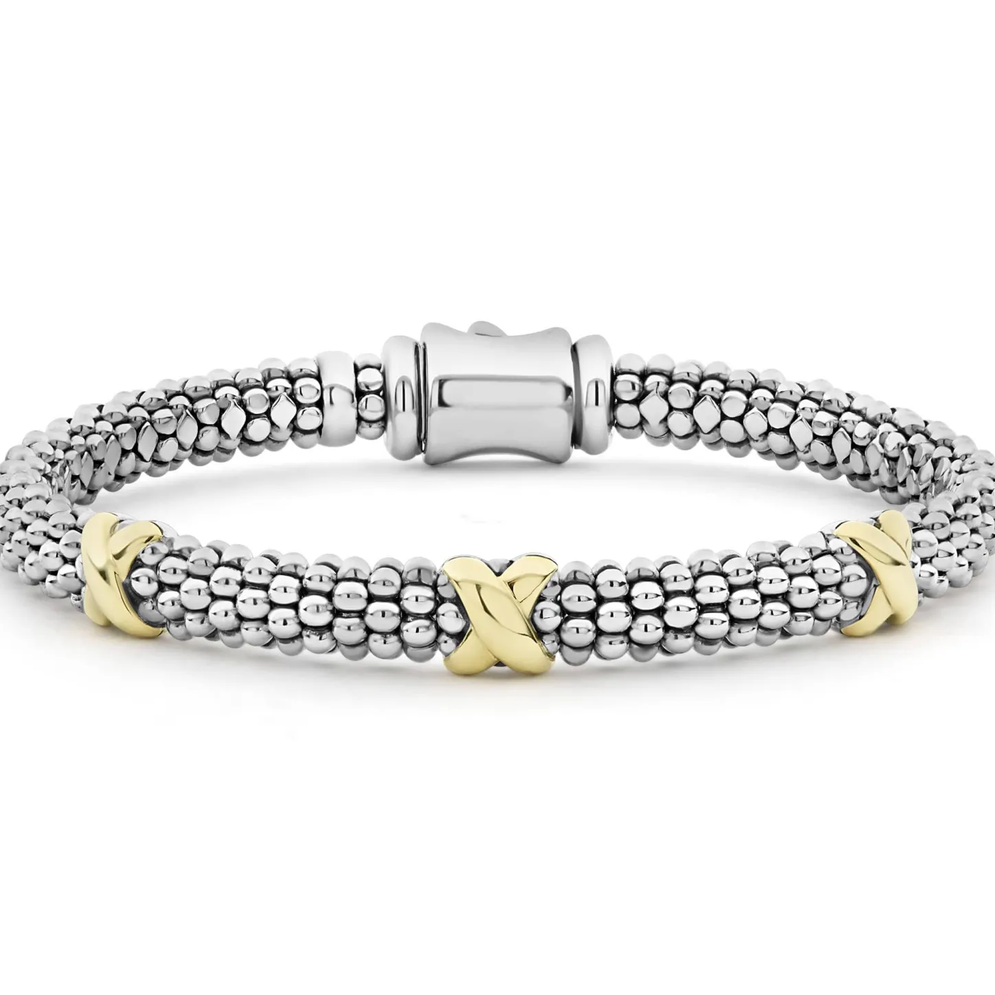 Caviar Beading Accented By Three 18K Gold X Stations Form This Detailed Lagos Bracelet.