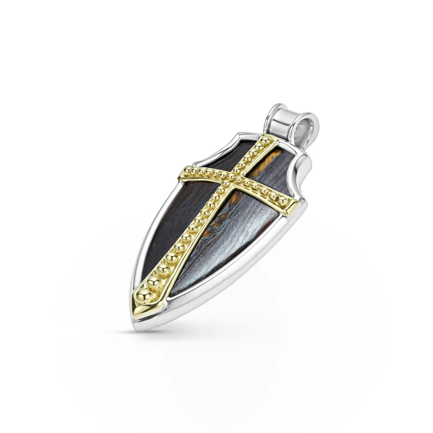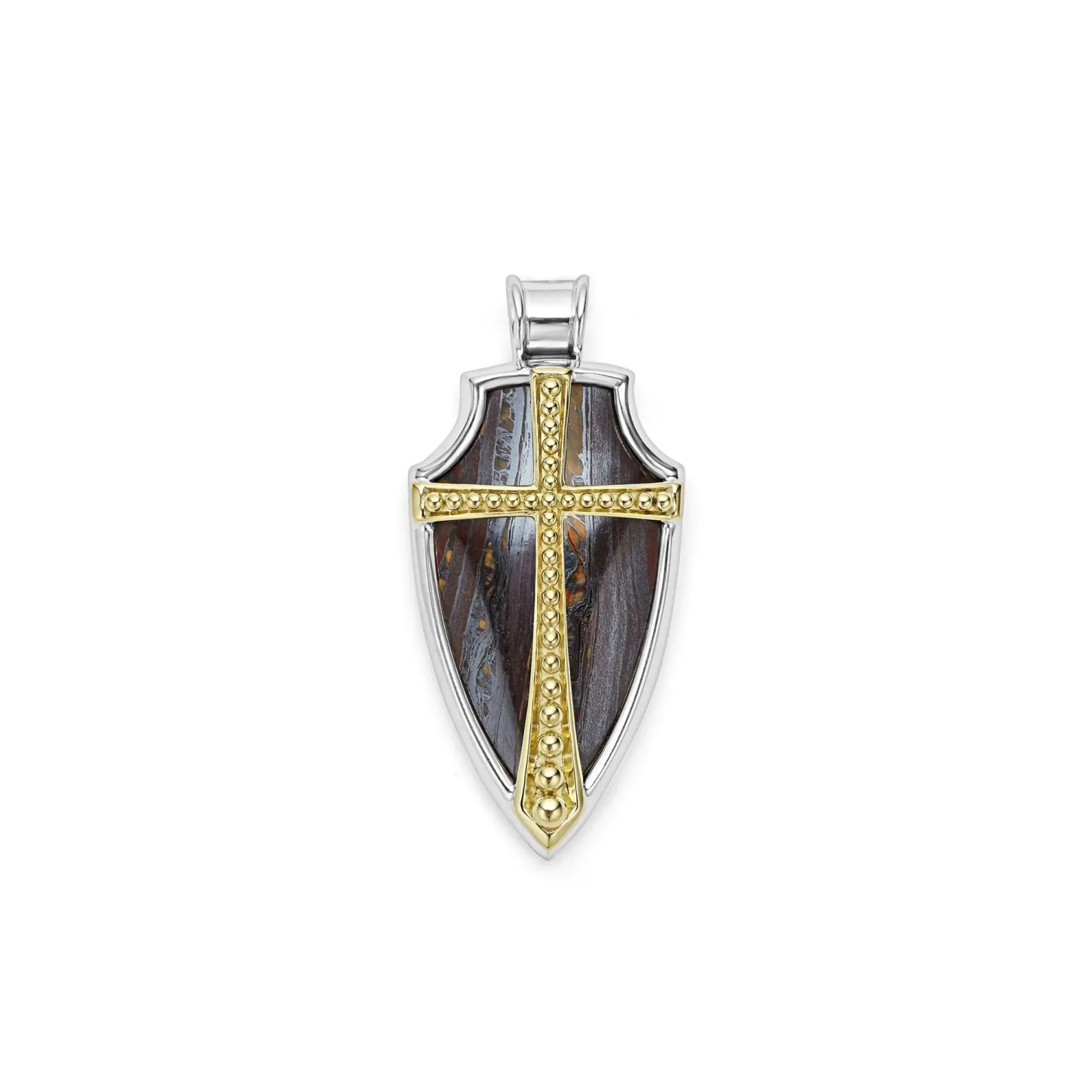 Tiger Iron Gemstone Accented By Sterling Silver And 18K Gold Caviar Beading Form This Shield Amulet.
