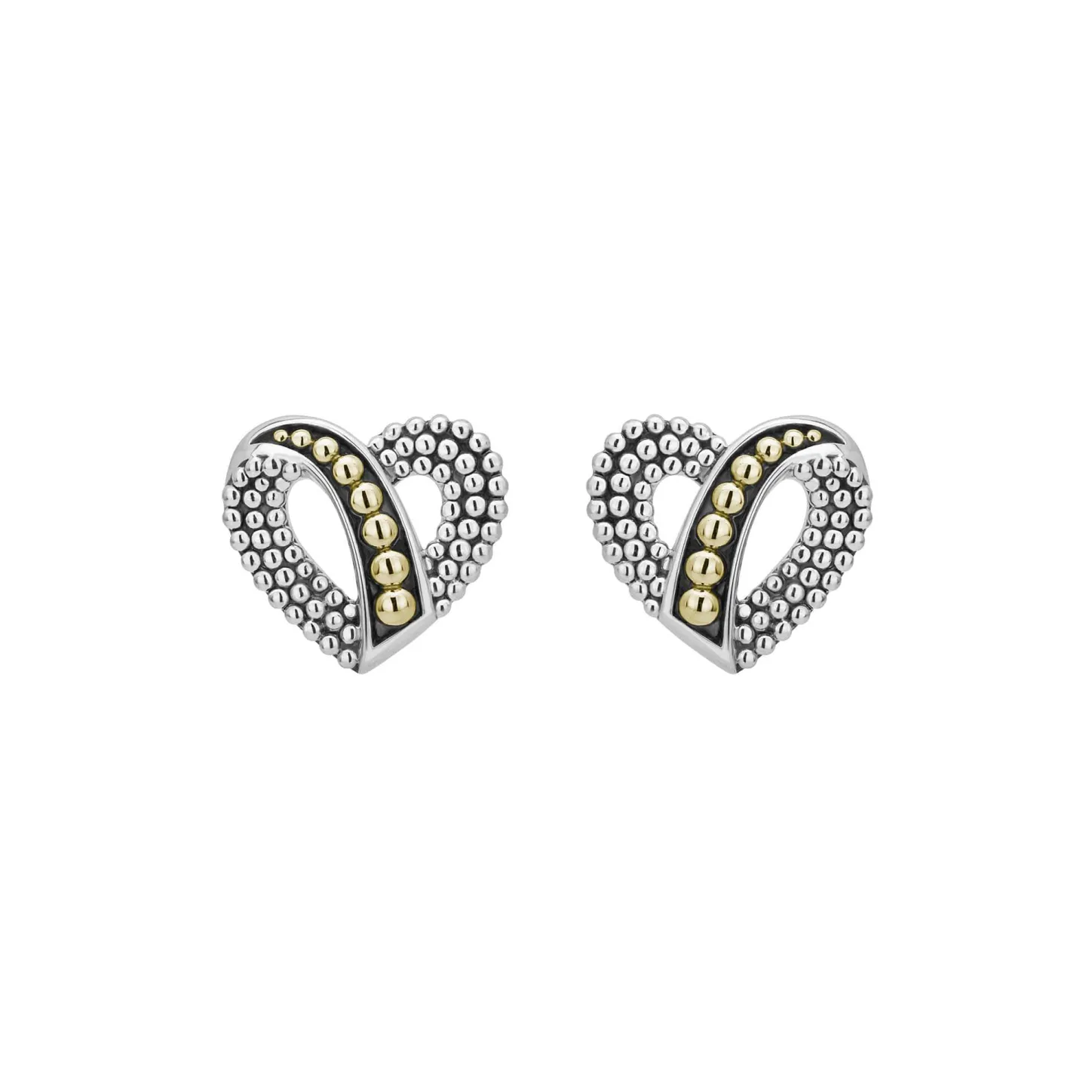Heart Stud Earrings With Classic Caviar Beading In Sterling Silver And Details Of 18K Gold.