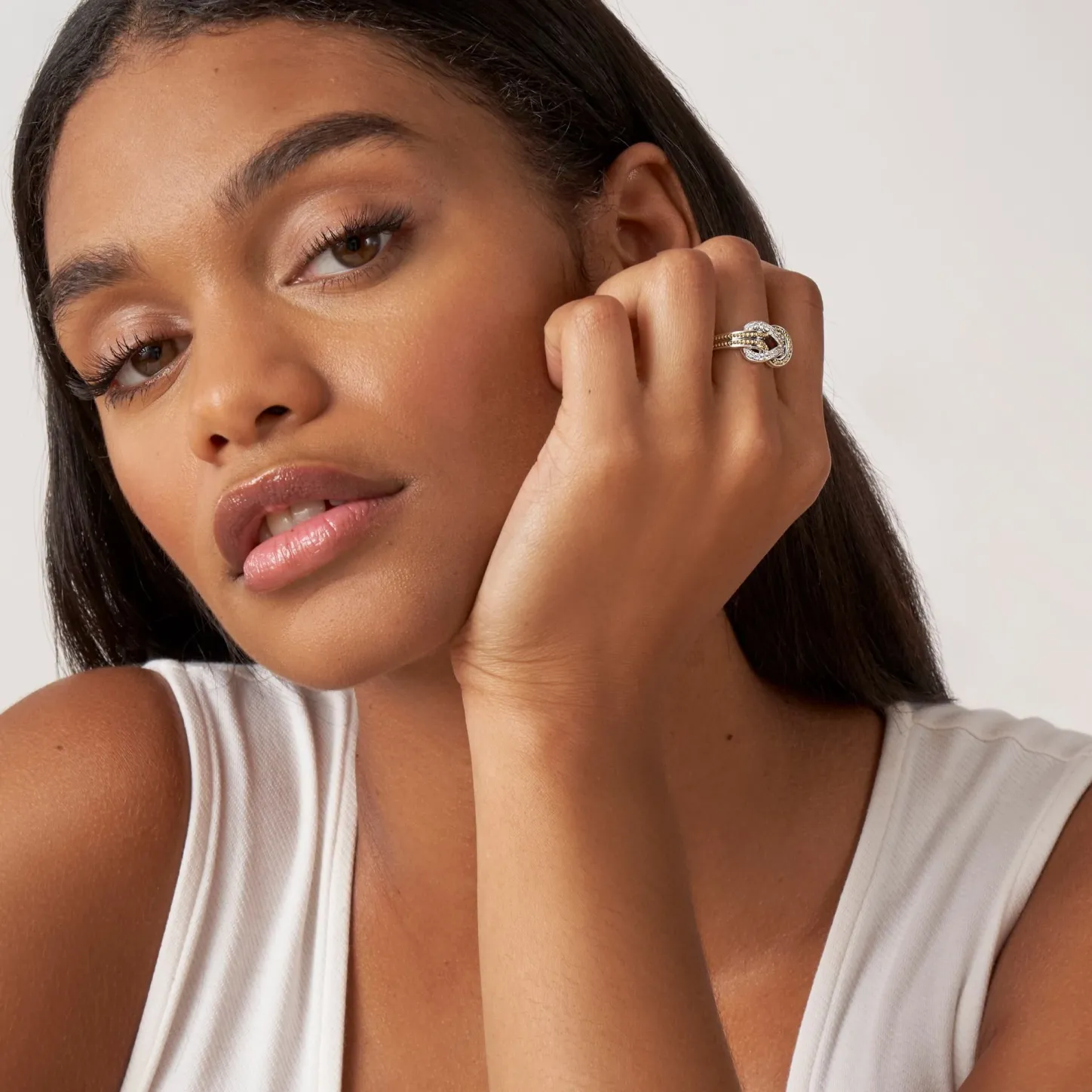 Diamonds And 18K Gold Woven In A Knot Motif Form This Ring. Lagos Diamonds Are The Highest Quality Natural Stones.