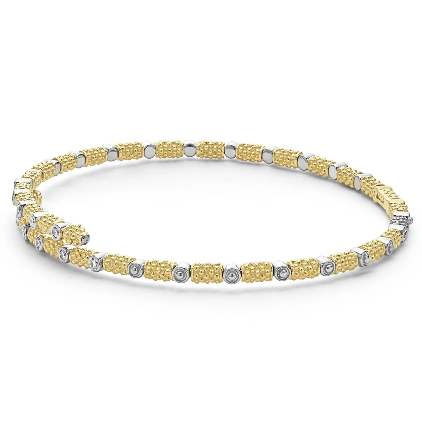 Diamonds Surrounded By 18K Gold Superfine Caviar Beading Form This Cuff Bracelet. Lagos Diamonds Are The Highest Quality Natural Stones.