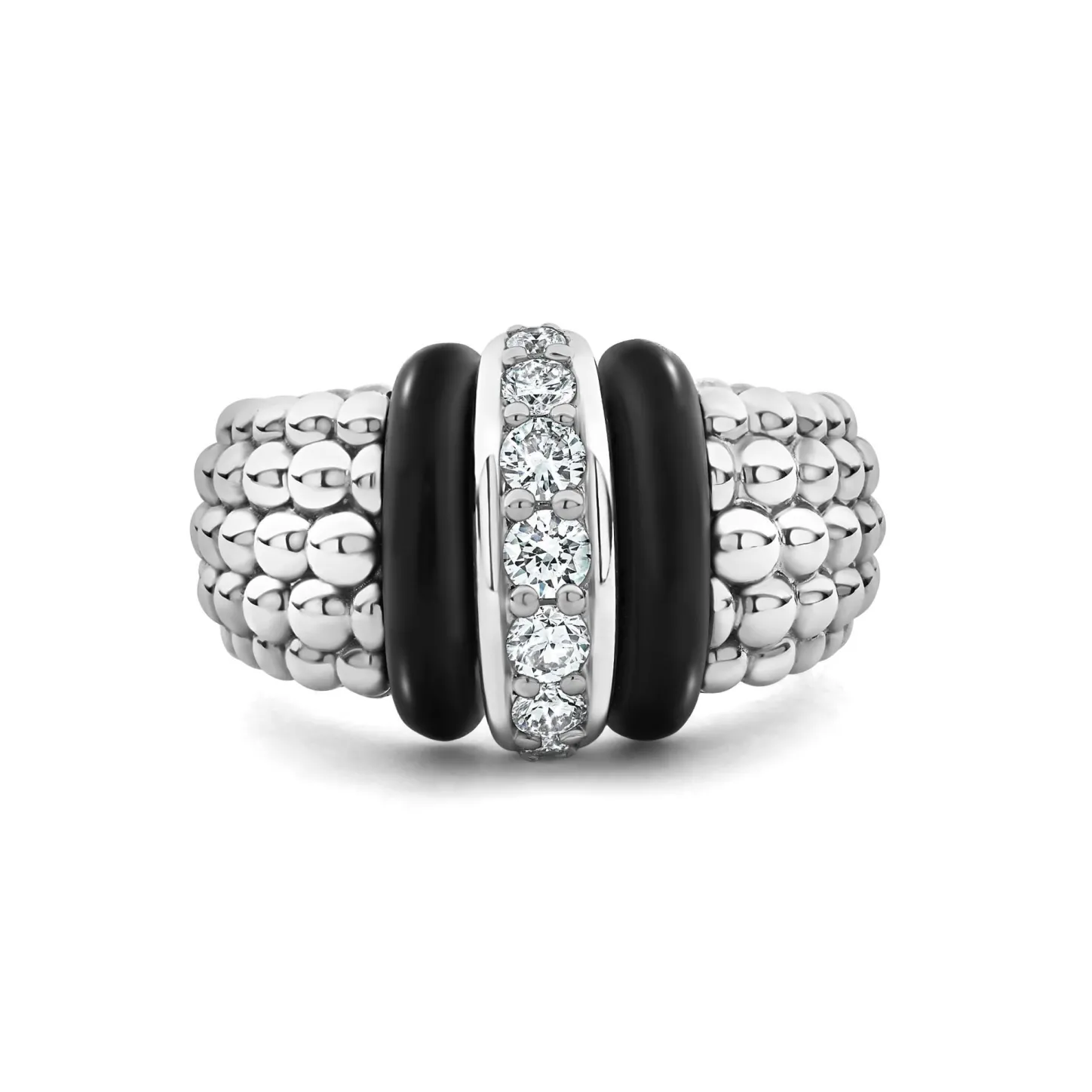 Diamonds Set In Sterling Silver Are Accented By Sleek Black Ceramic And Caviar Beading On This Ring. Lagos Diamonds Are The Highest Quality Natural Stones.