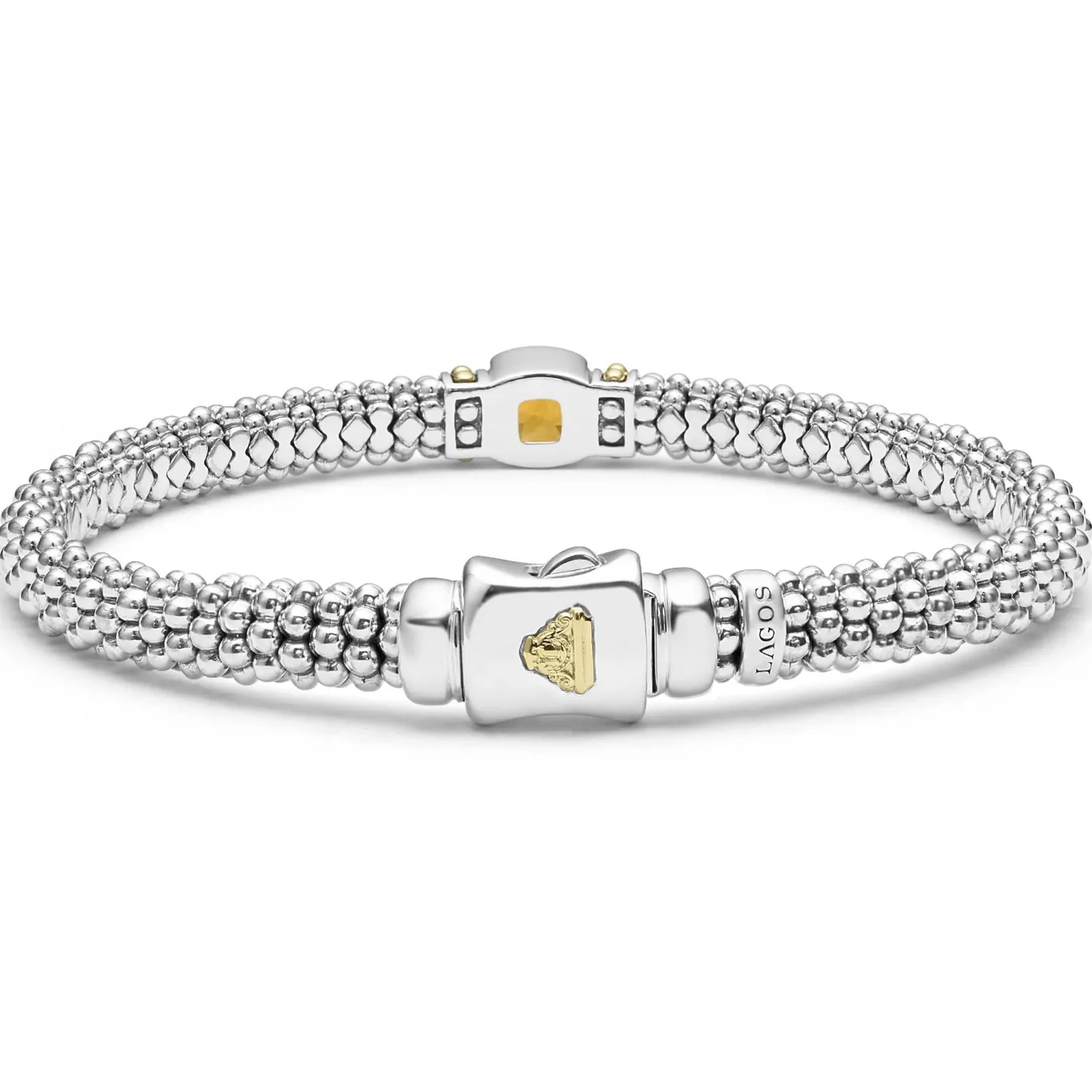 A Citrine Gemstone And Sterling Silver Caviar Beading With 18K Gold Detailing Forms This Bracelet.