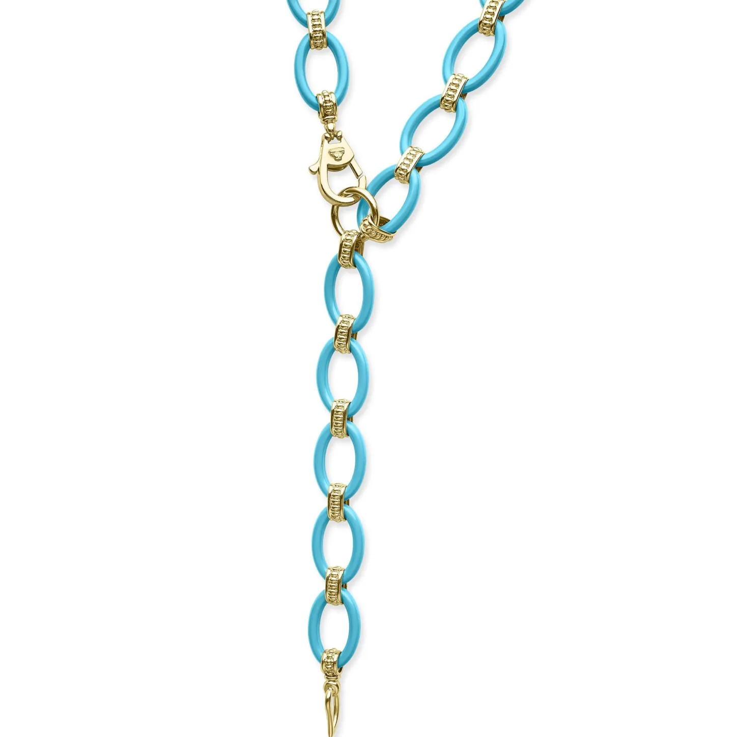 A 36 Inch Long Necklace With 18K Gold And Blue Ceramic Round, Oval And Beaded Links.
