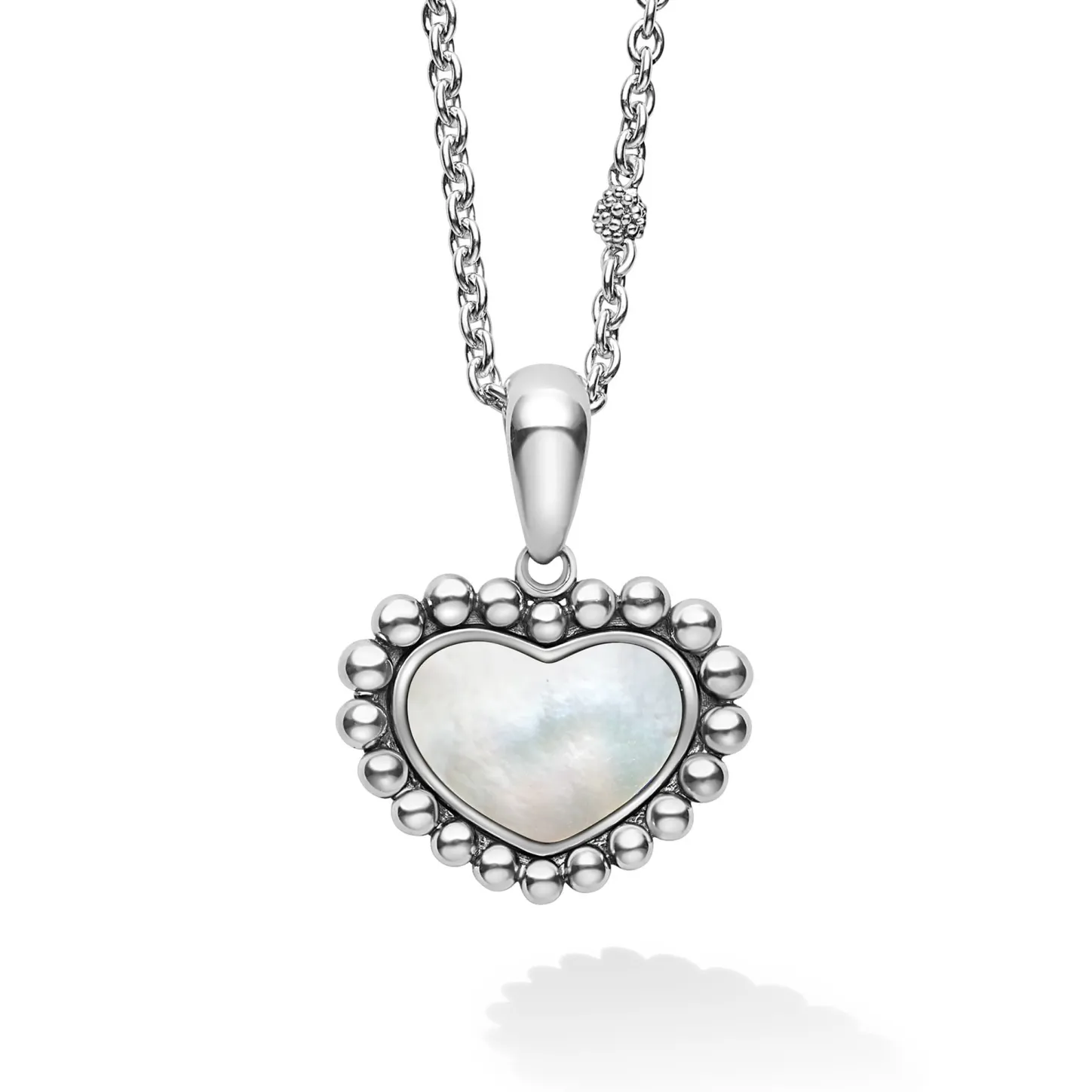 A Mother Of Pearl Gemstone Pendant Framed By Sterling Silver Caviar Beading In The Shape Of A Heart Finished On An Adjustable 16-18 Inch Necklace.