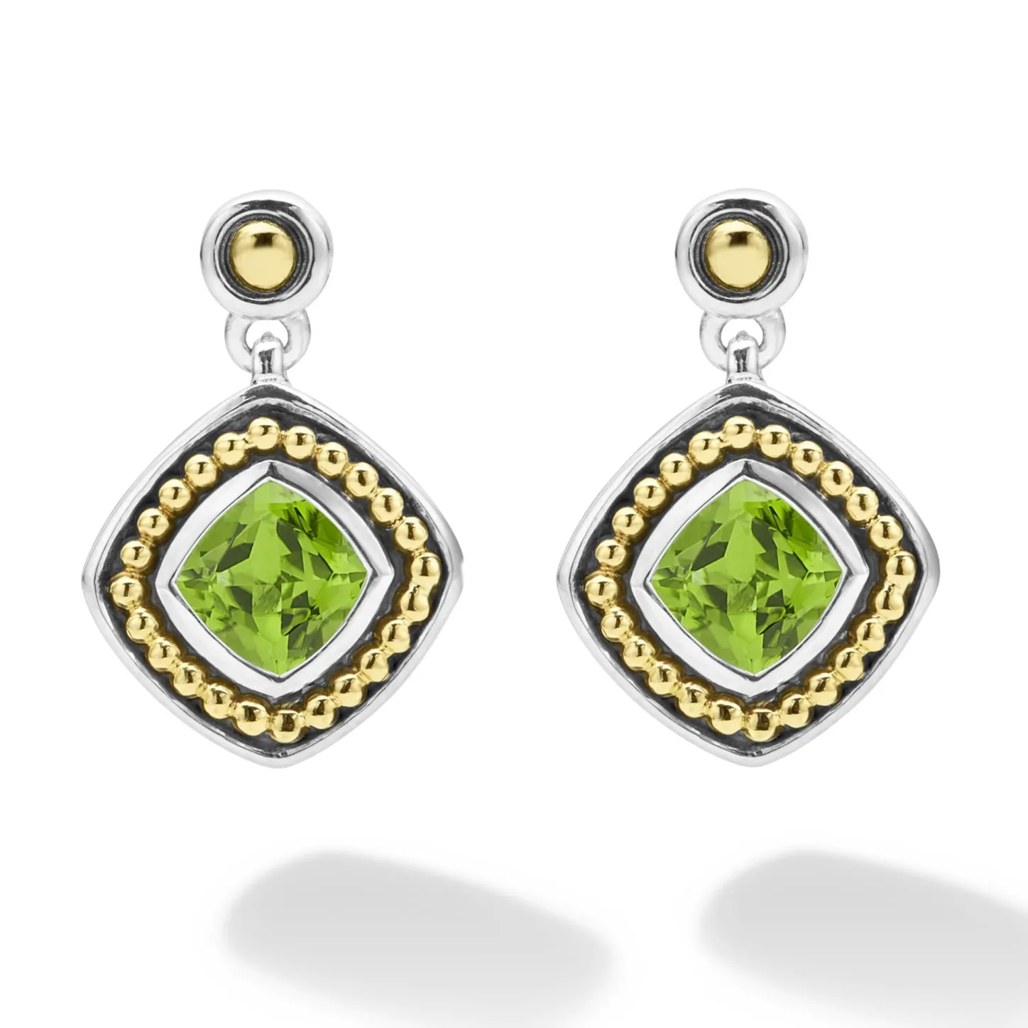 Peridot Gemstone Drop Earrings Surrounded By Sterling Silver And 18K Gold Caviar Beading.