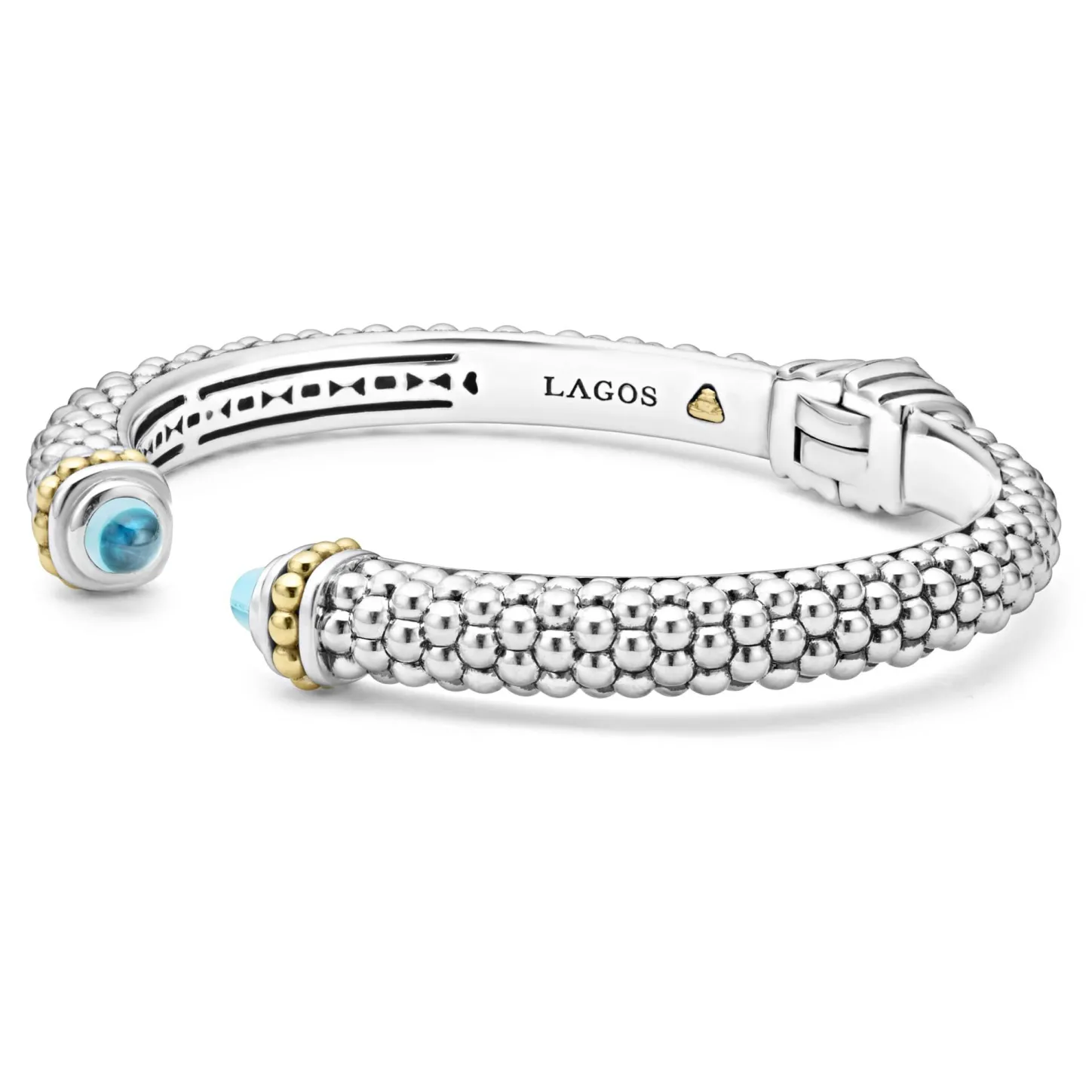 Caviar Beading And Highly Polished Sterling Silver Stations Comprise This Innovative Cuff Bracelet Detailing Swiss Blue Topaz Gemstone End Caps.
