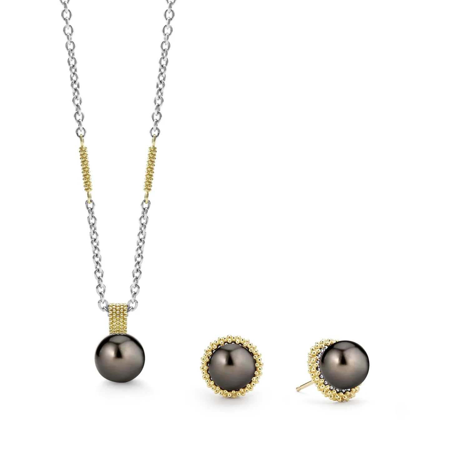 A Lagos Exclusive. One Set Of 18K Gold Tahitian Black Pearl Necklace And Earrings.