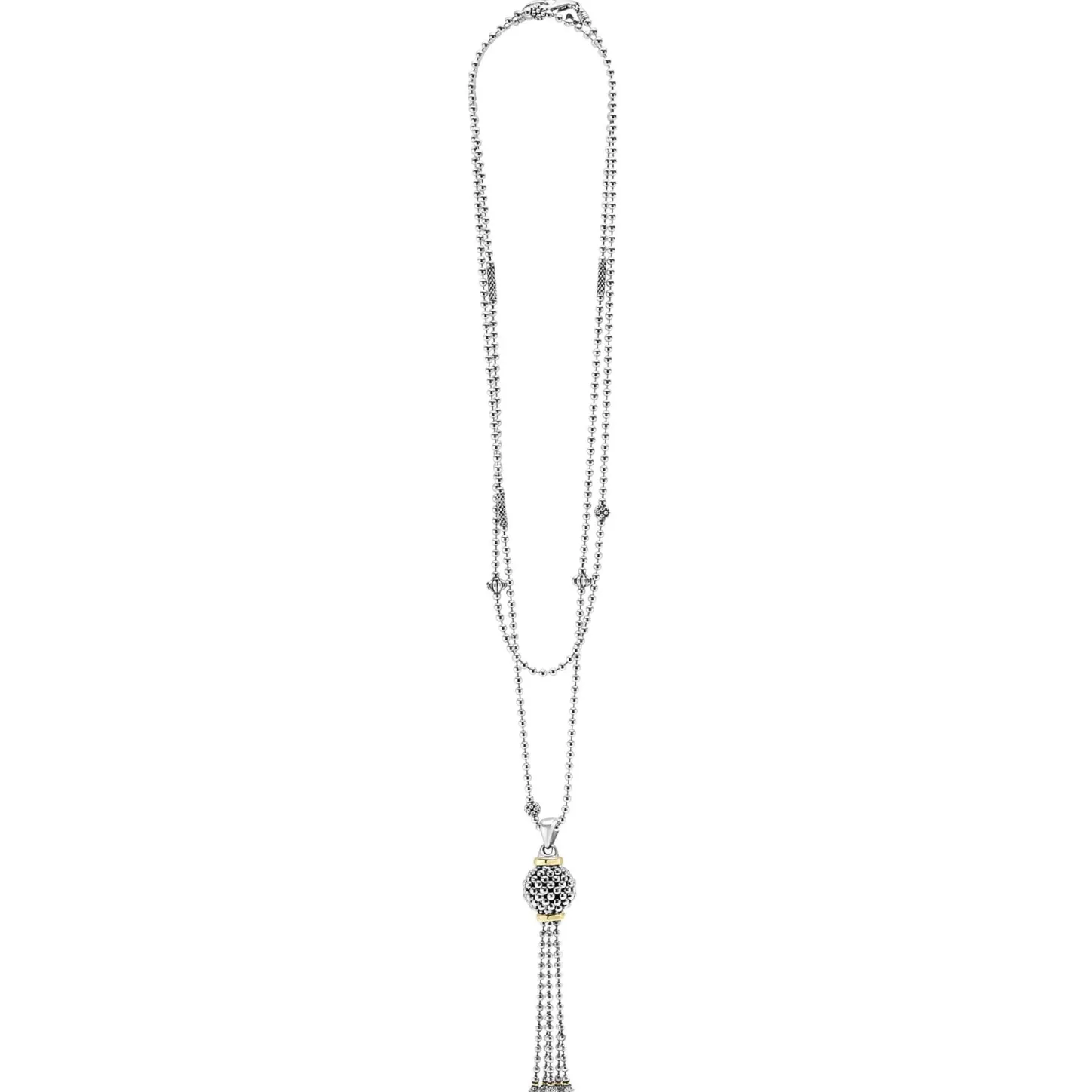 Caviar Tassel Pendant With 18K Gold And Sterling Silver On A Ball Chain Necklace Accented With Caviar Beaded Details.