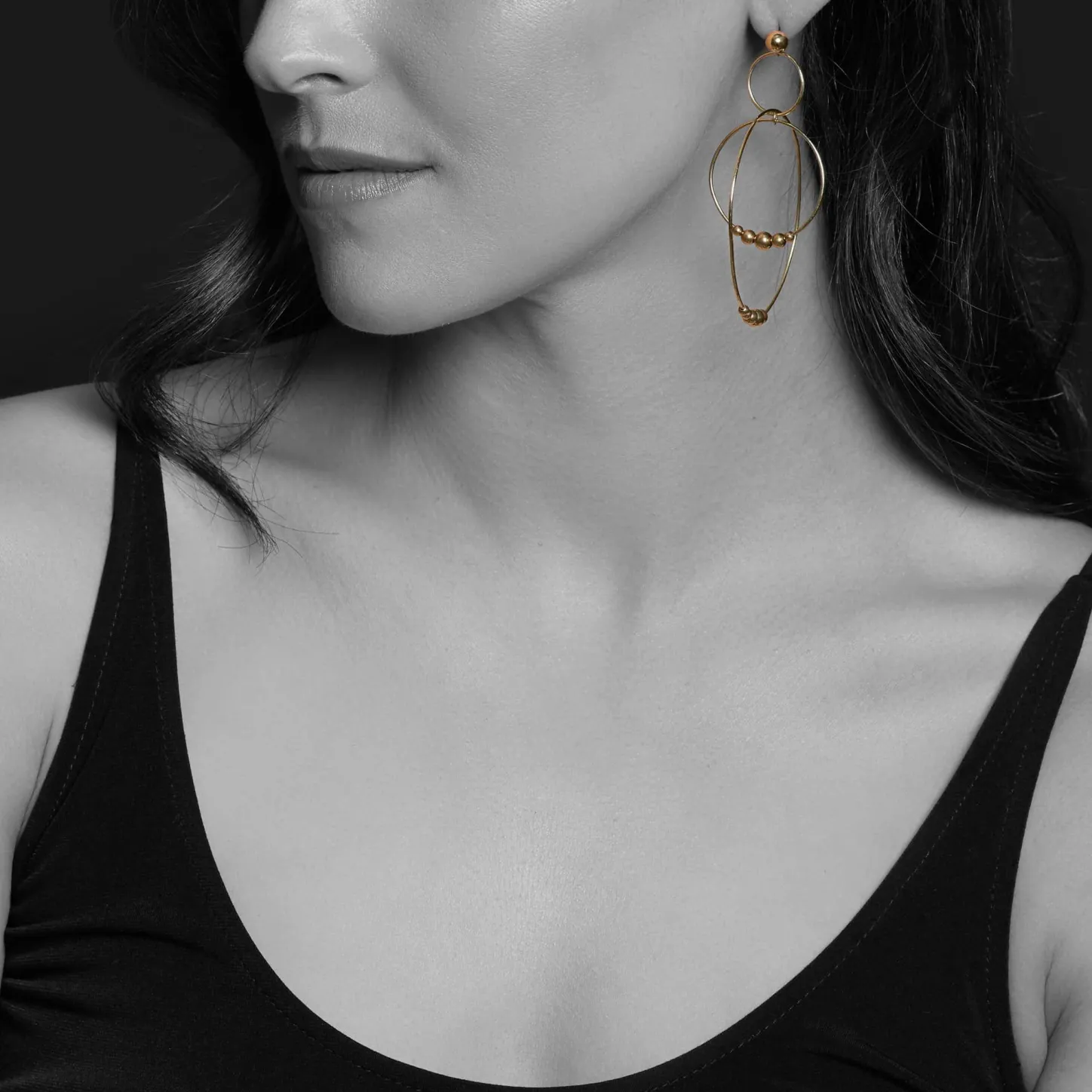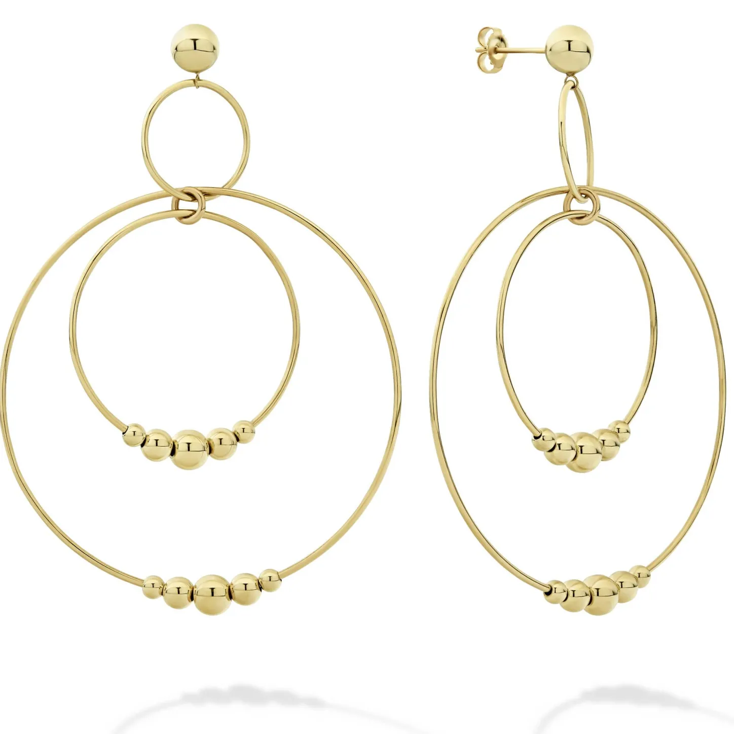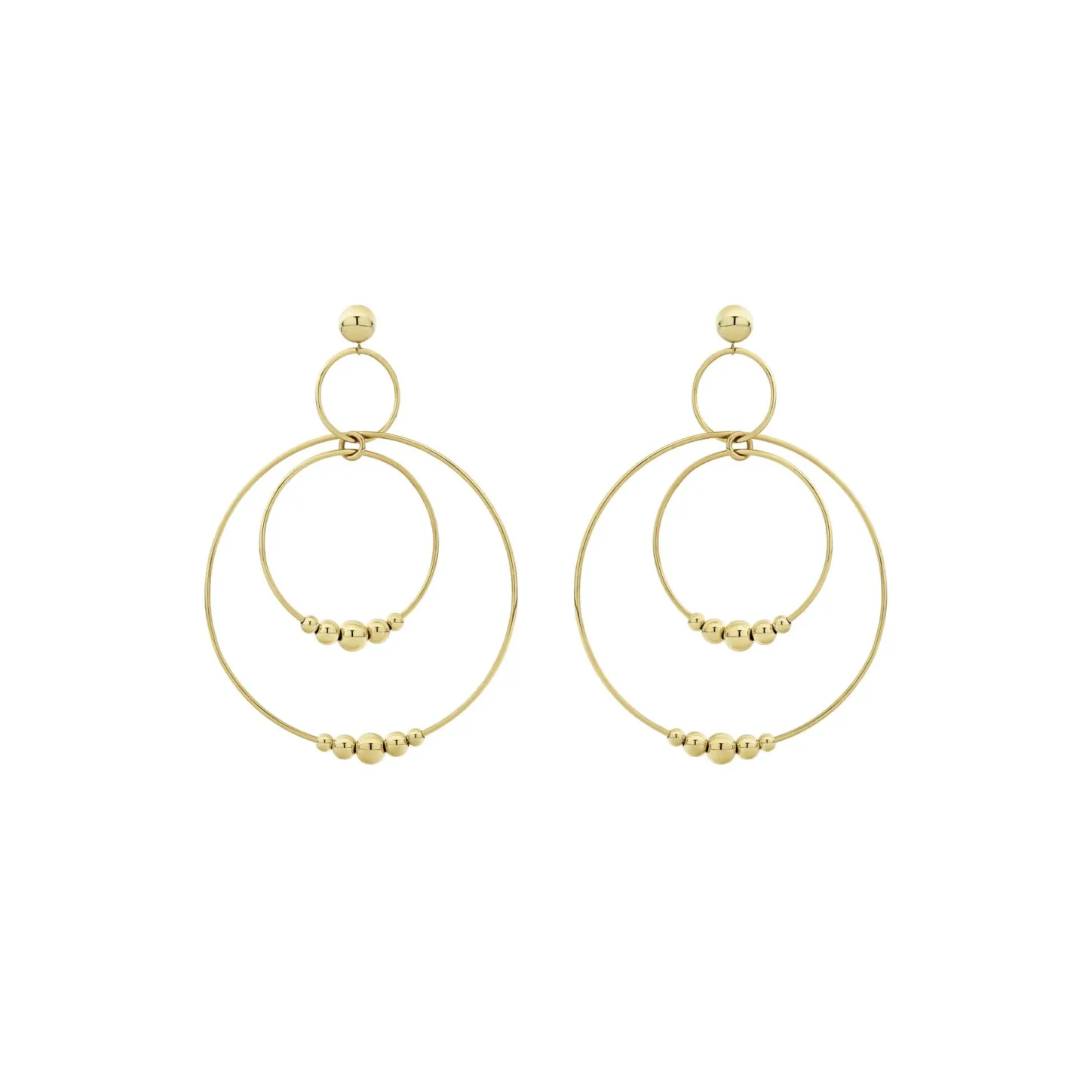18K Gold Drop Hoop Earrings With 10 Graduated Bead Accents.