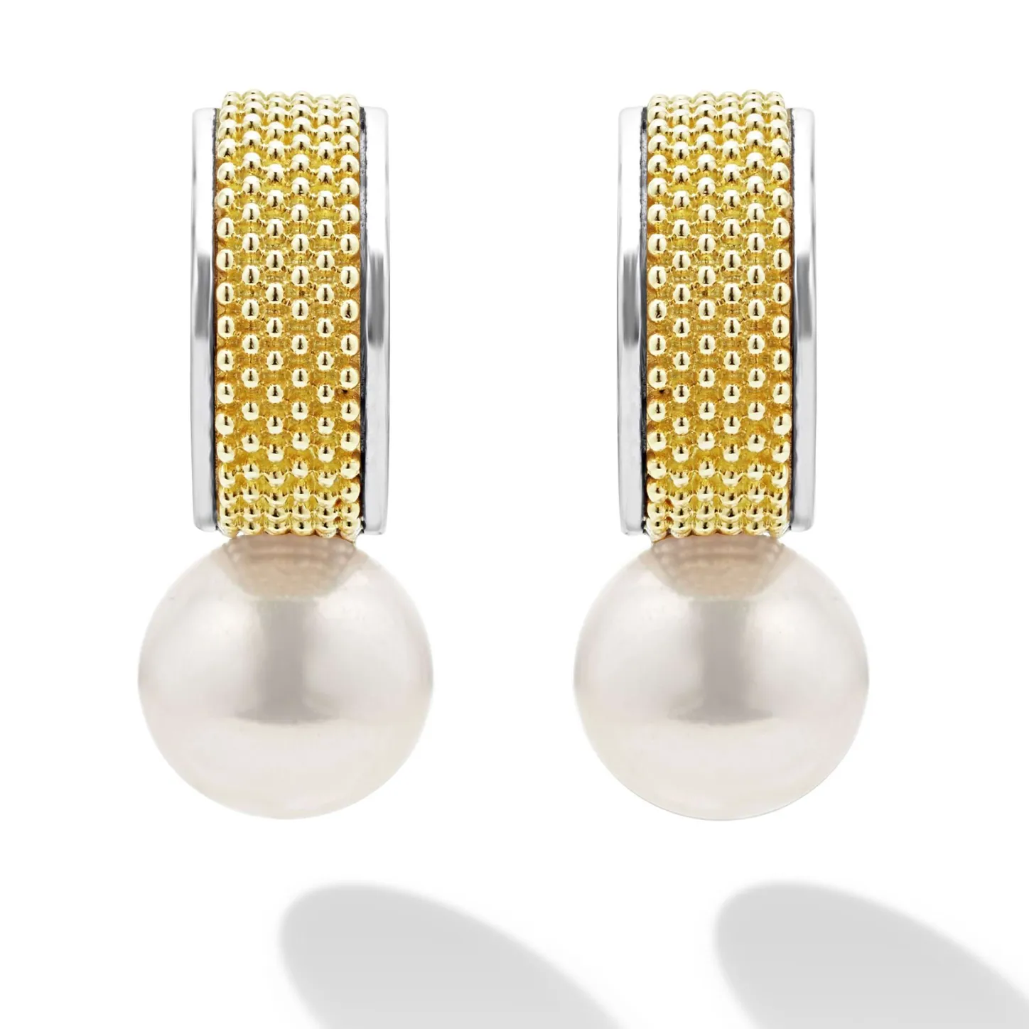 18K Gold And Sterling Silver Caviar Beading With A Pearl Drop Detailing Form These Hoop Earrings.