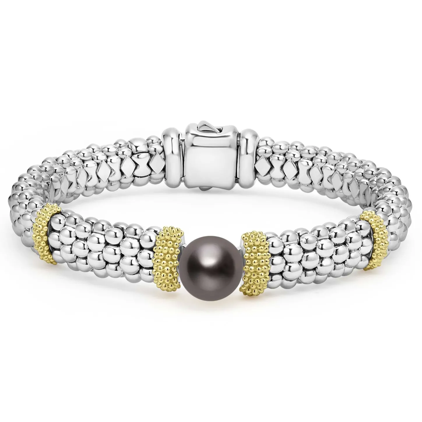A Sterling Silver Caviar Bracelet With A Tahitian Black Pearl Accented By 18K Gold Stations.