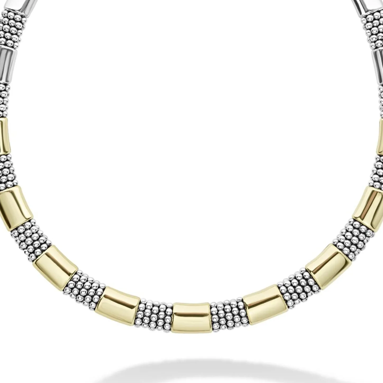 Smooth Stations Of 18K Gold And Sterling Silver Surrounded By Caviar Beading.