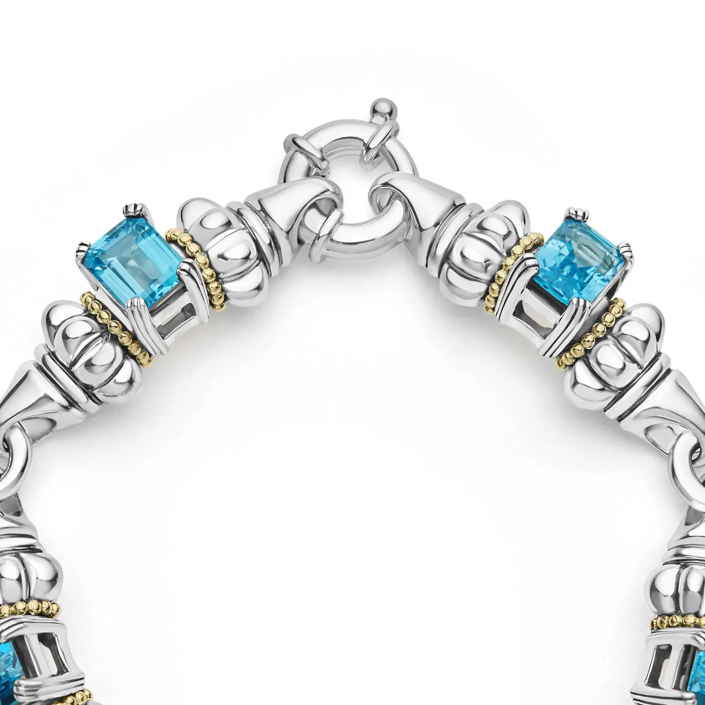 Five Swiss Blue Topaz Emerald-Cut Gemstones, With 18K Gold And Sterling Silver Detailing Form This Bracelet.