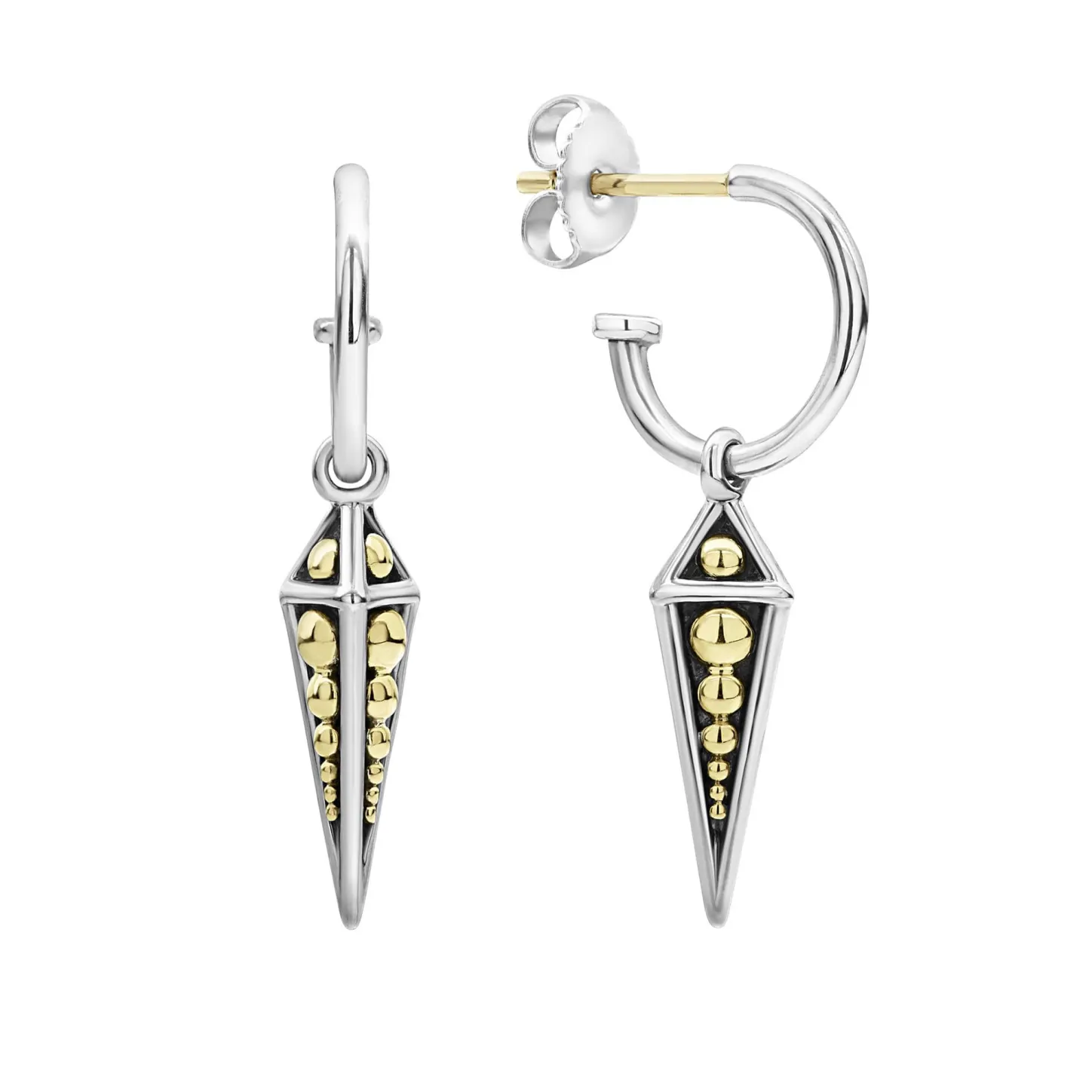 Drop Pyramid Charms With 18K Gold And Sterling Silver Caviar Beading On A Sterling Silver Hoop.