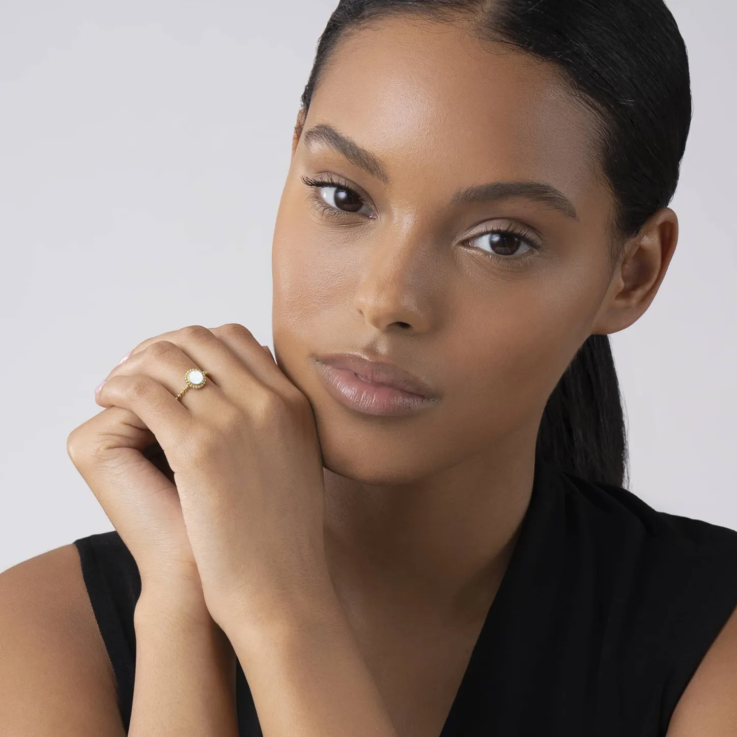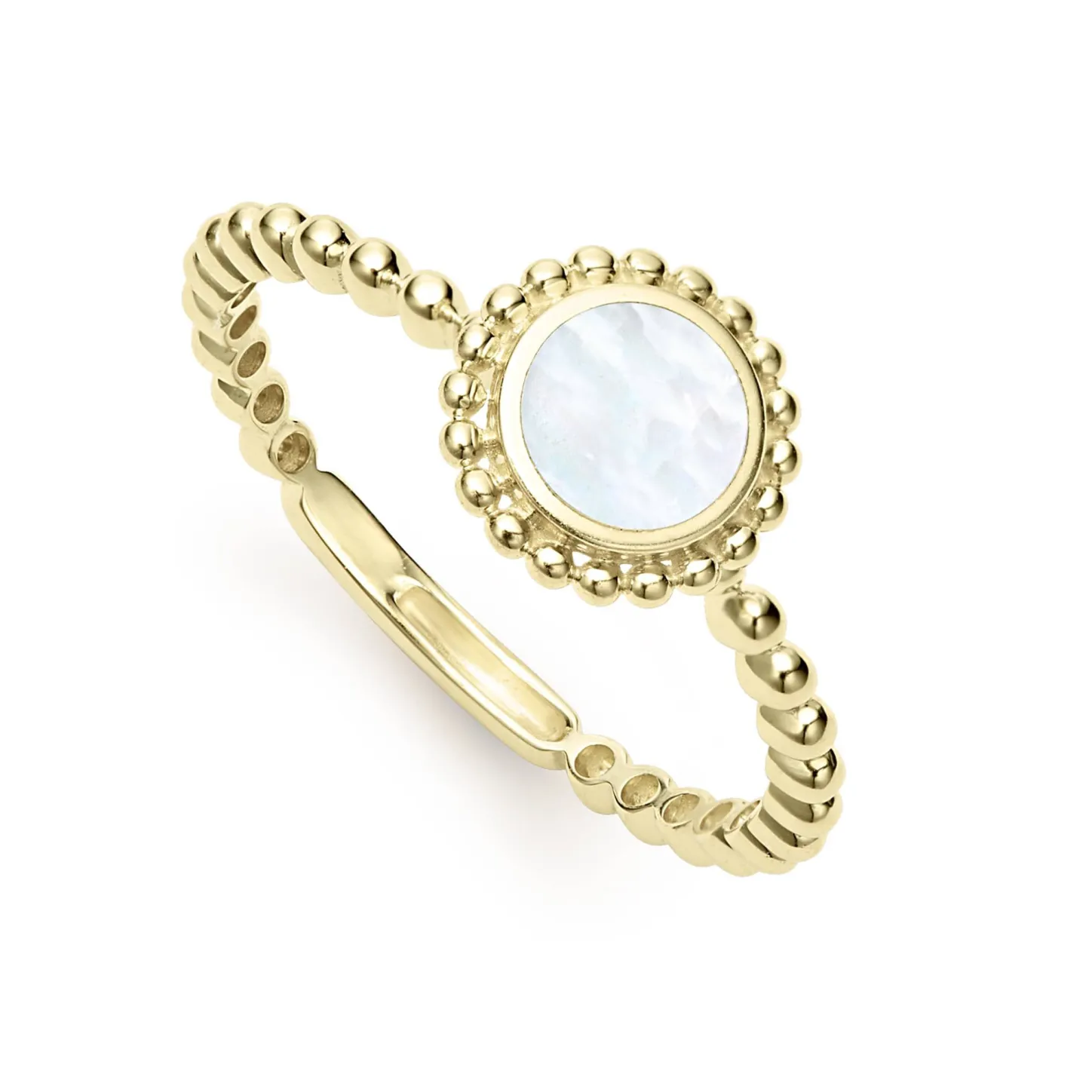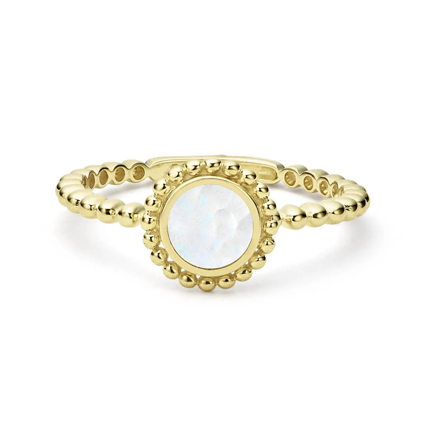 Round Mother Of Pearl Stacking Ring That Is Set And Surrounded By 18K Gold Caviar Beading.