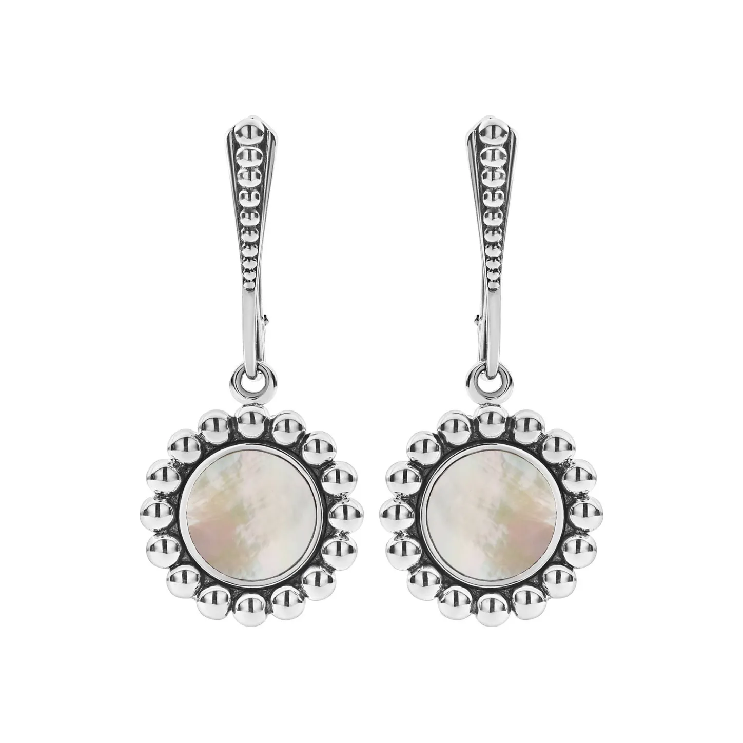 Mother Of Pearl Gemstone Circle Drop Earrings Framed By Caviar Beading.