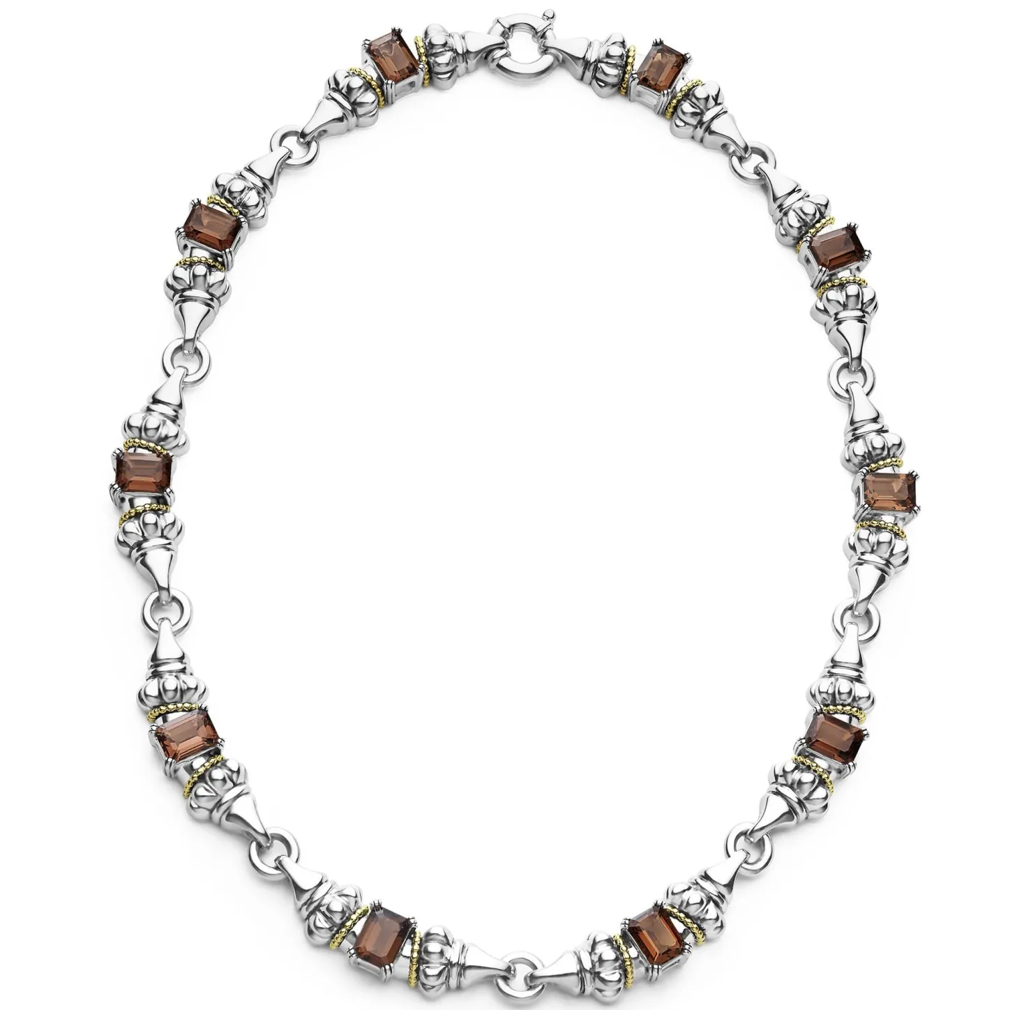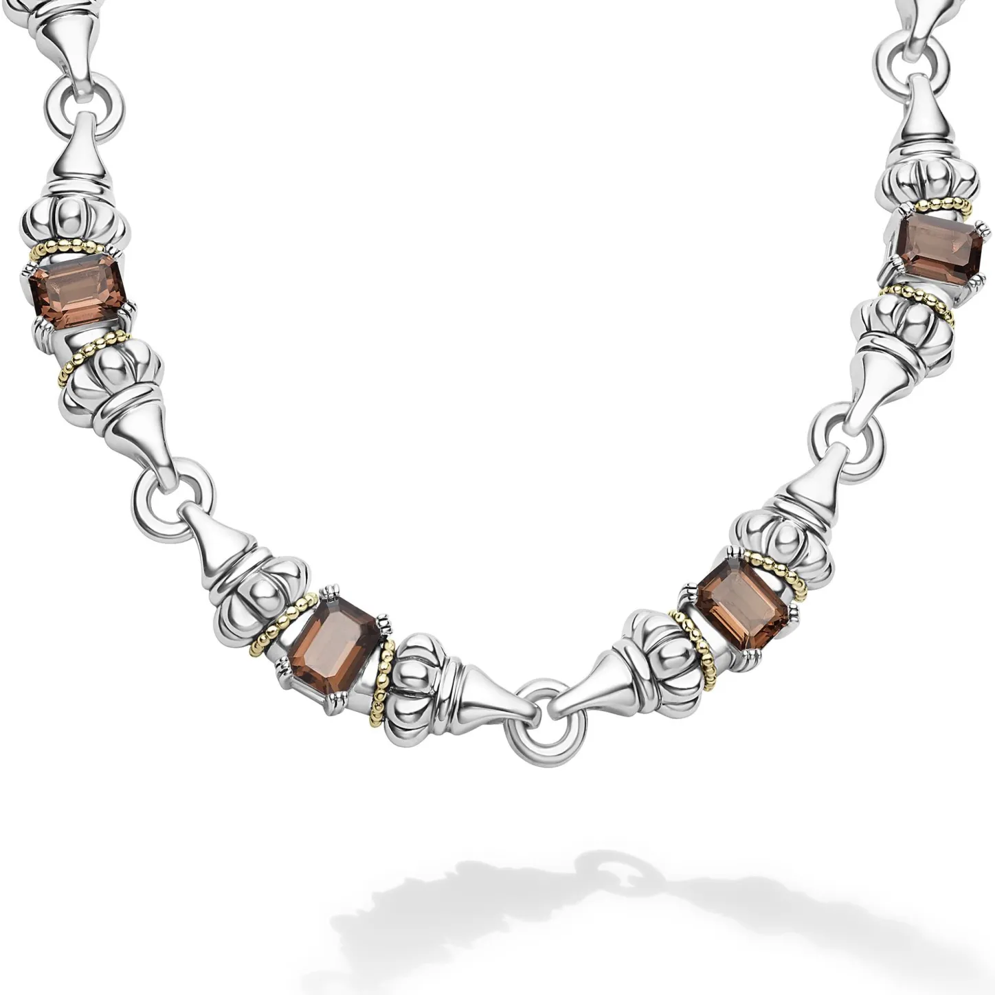 Ten Emerald-Cut Smokey Quartz Gemstones With A Prong Setting In Sterling Silver And 18K Gold Caviar Beading Form This Necklace.