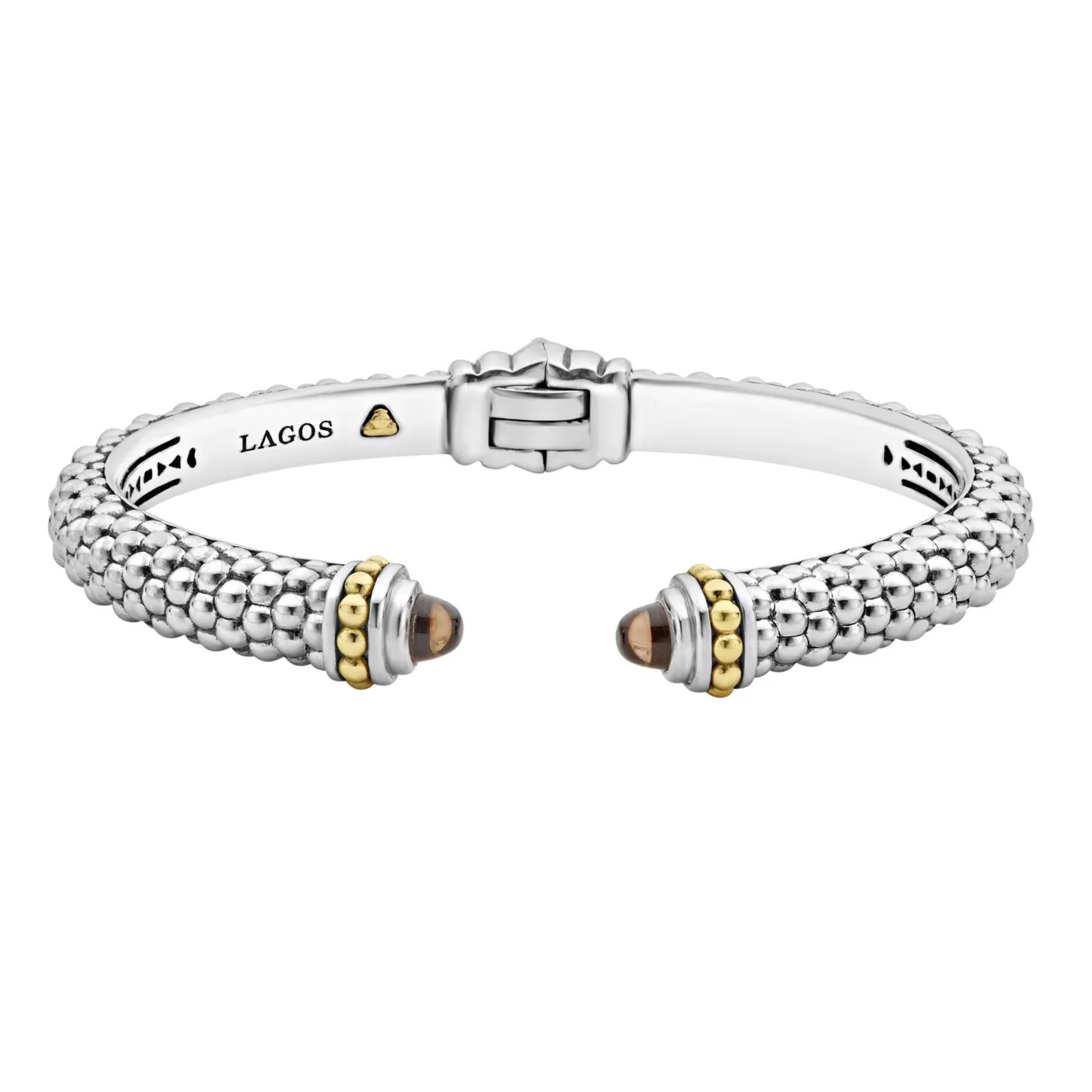 Caviar Beading With Highly Polished Sterling Silver Stations Comprise This Innovative Cuff Bracelet Detailing Faceted Smokey Quartz Gemstone End Caps. Finished With A Hinge Clasp.