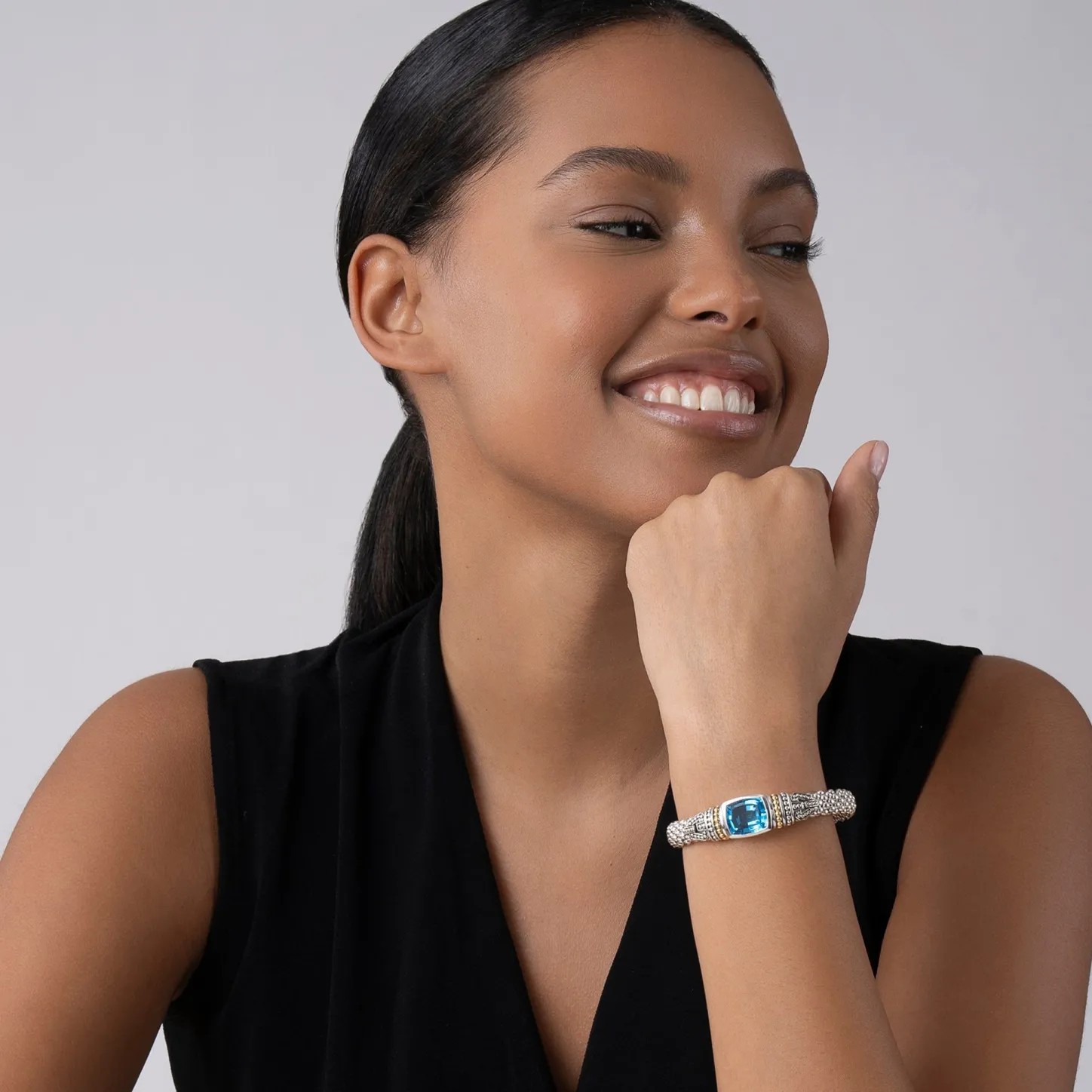 Swiss Blue Topaz Bezel-Set Gemstone And Sterling Silver Caviar Beading With 18K Gold Detailing Forms This Bracelet.