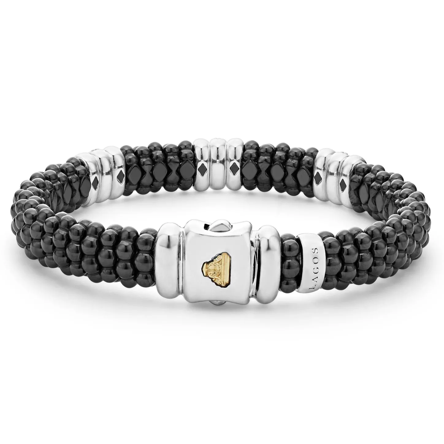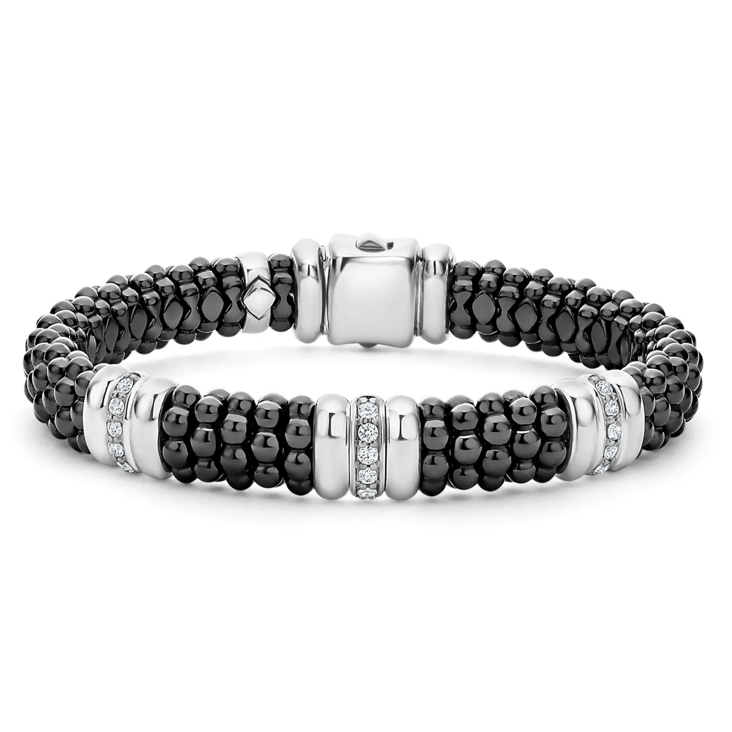 Three Diamond And Sterling Silver Stations Set In A Black Ceramic Beaded Bracelet. Lagos Diamonds Are The Highest Quality Natural Stones.