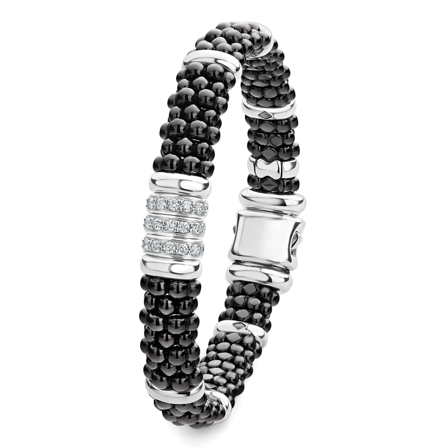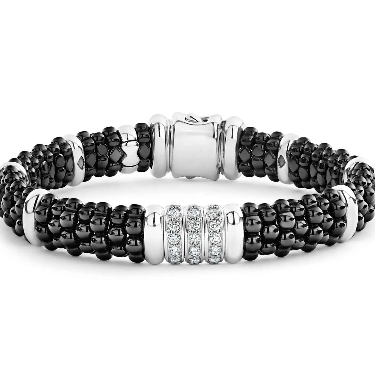 Three Diamond Stations Set In Sterling Silver Surrounded By Black Ceramic Caviar Beading. Lagos Diamonds Are The Highest Quality Natural Stones.
