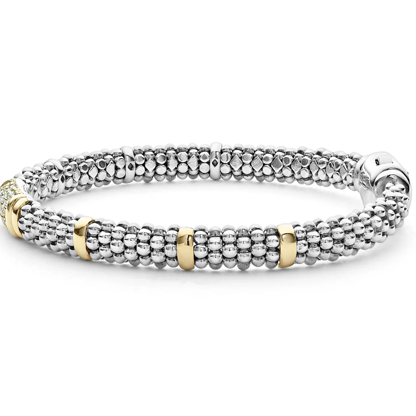 Ten 18K Gold Stations On This Sterling Silver Caviar Beaded Bracelet With Pavé Diamonds Set In 18K Gold. Lagos Diamonds Are The Highest Quality Natural Stones.