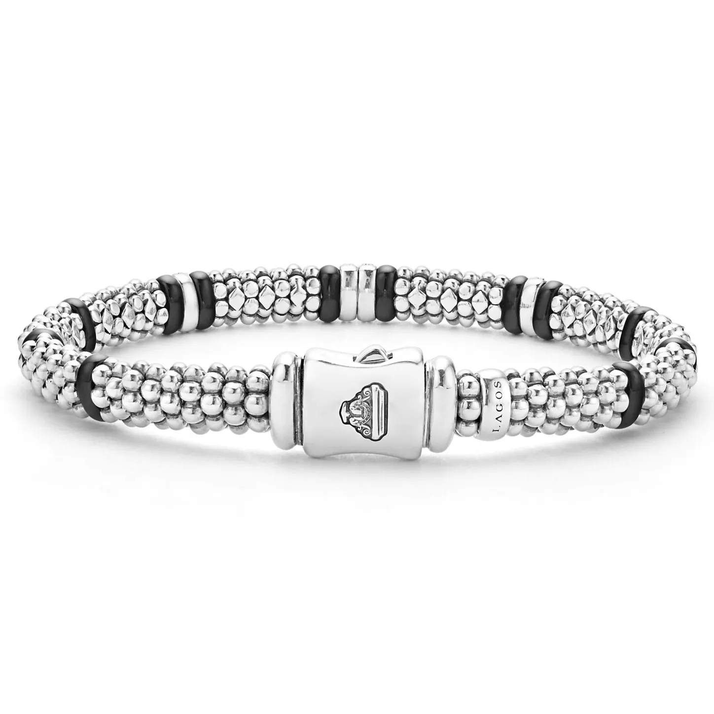 Four Diamond Station Set In Sterling Silver Surrounded By Black Ceramic And Caviar Beading. Lagos Diamonds Are The Highest Quality Natural Stones.