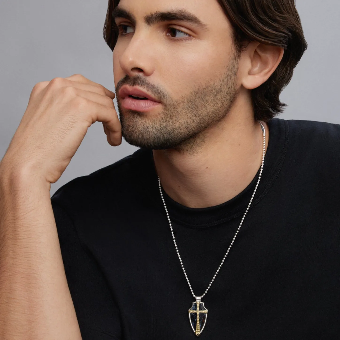 Pietersite Gemstone Accented By Sterling Silver And 18K Gold Caviar Beading Form This Shield Amulet.
