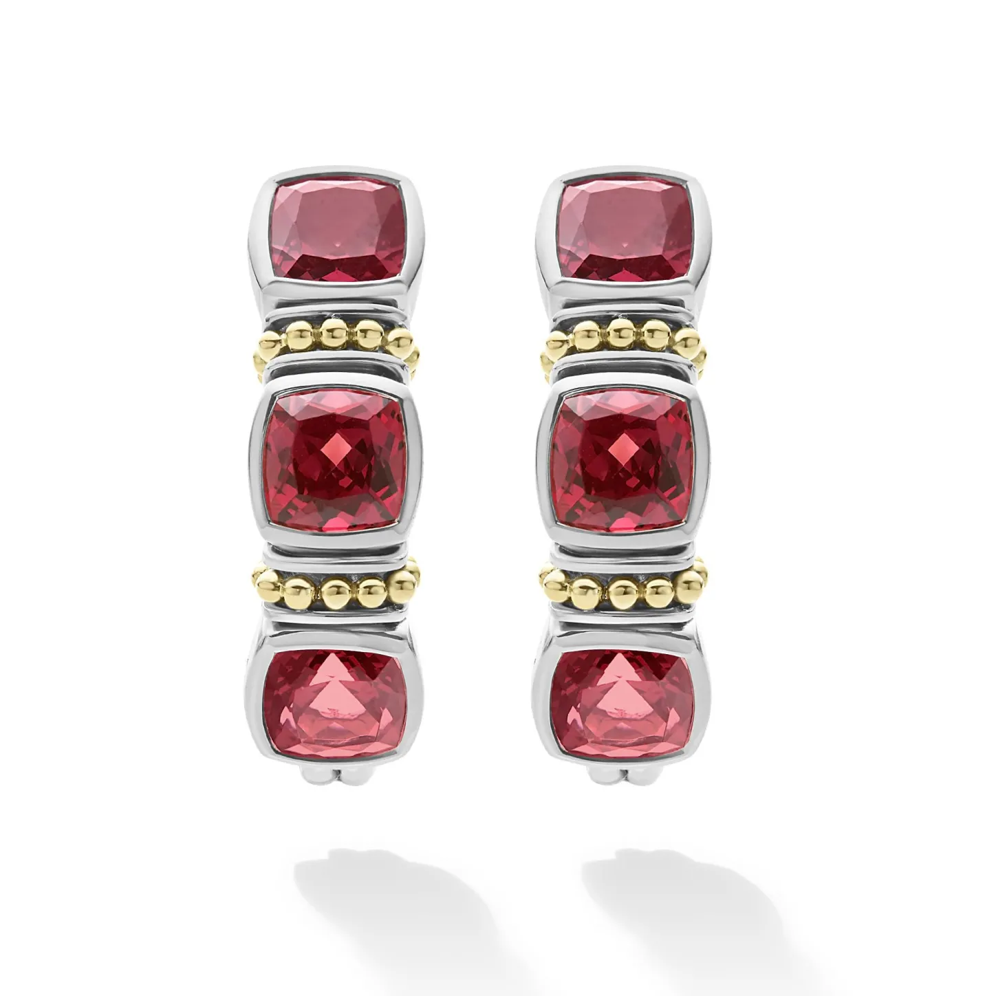 Rhodolite Garnet Gemstone Hoop Earrings Surrounded By Sterling Silver And 18K Gold Caviar Beading.