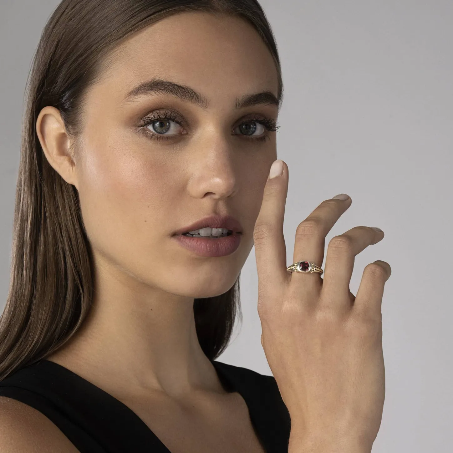 A Rhodolite Garnet Gemstone Ring Surrounded By Sterling Silver And 18K Gold Caviar Beading.