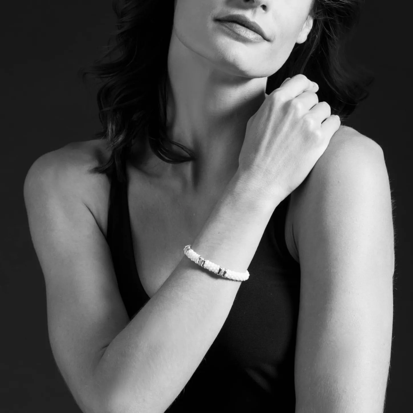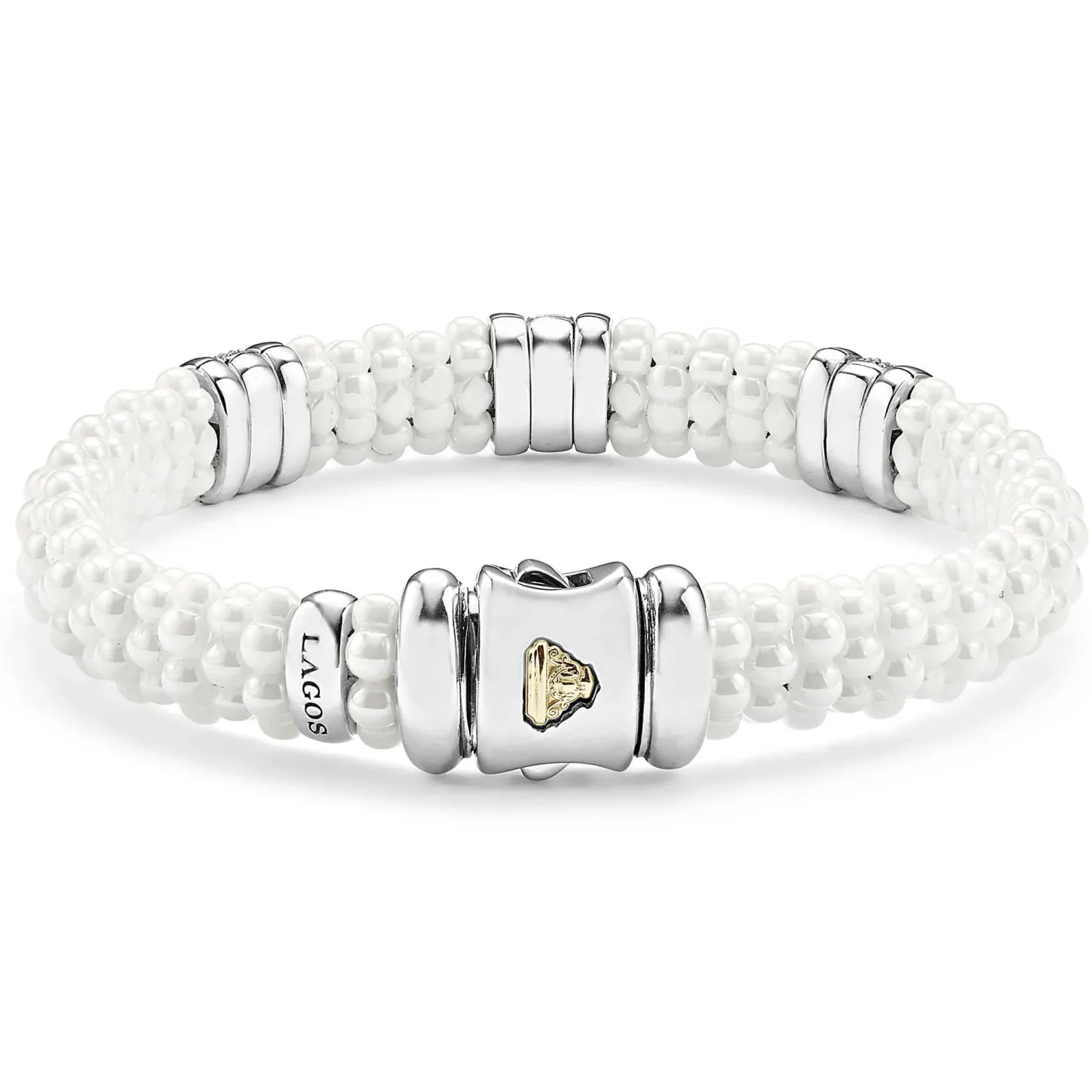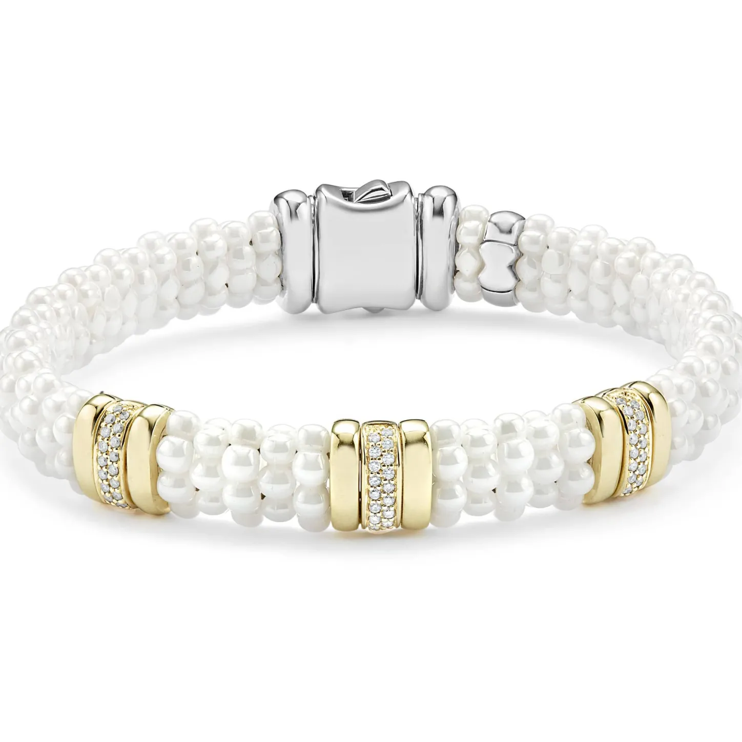 White Caviar Beaded Ceramic Bracelet With 18K Gold And Three Diamond Stations.