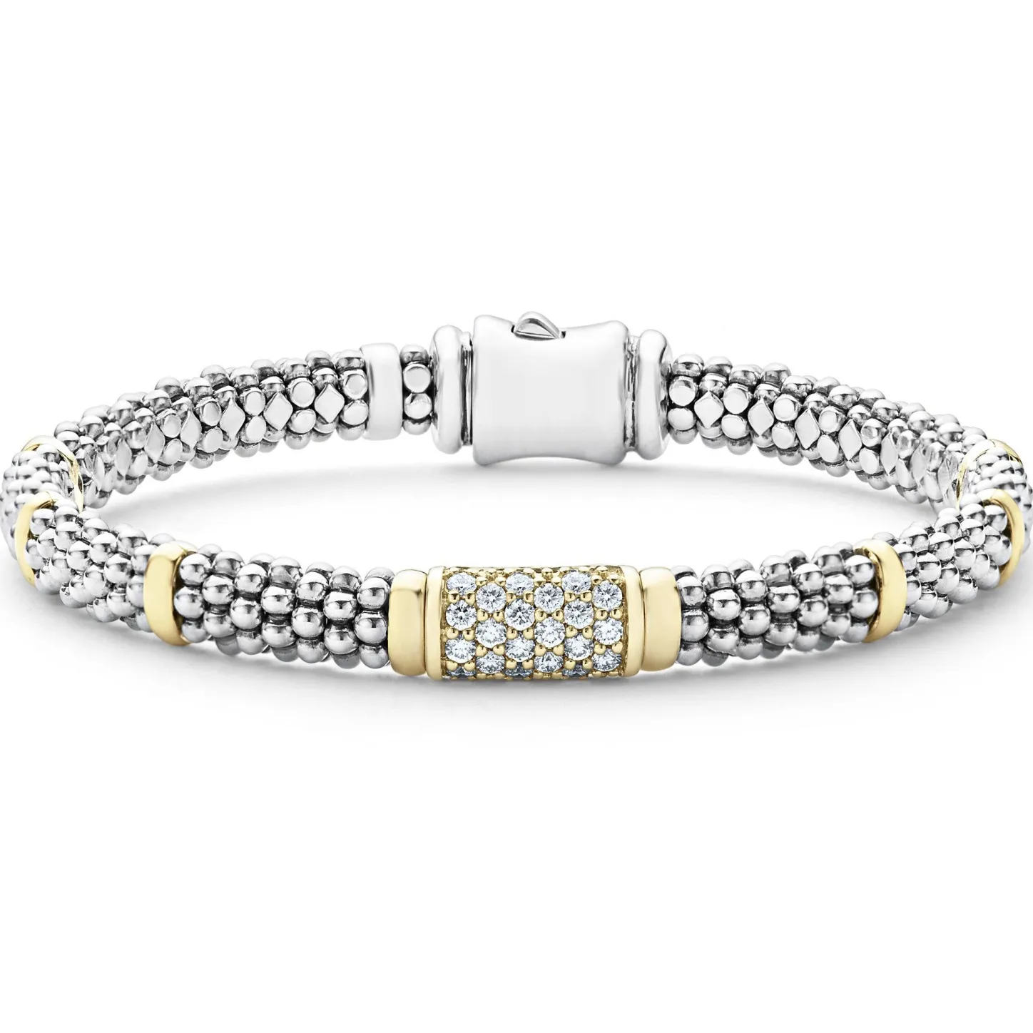 Ten 18K Gold Stations On This Sterling Silver Caviar Beaded Bracelet With Pavé Diamonds Set In 18K Gold. Lagos Diamonds Are The Highest Quality Natural Stones.