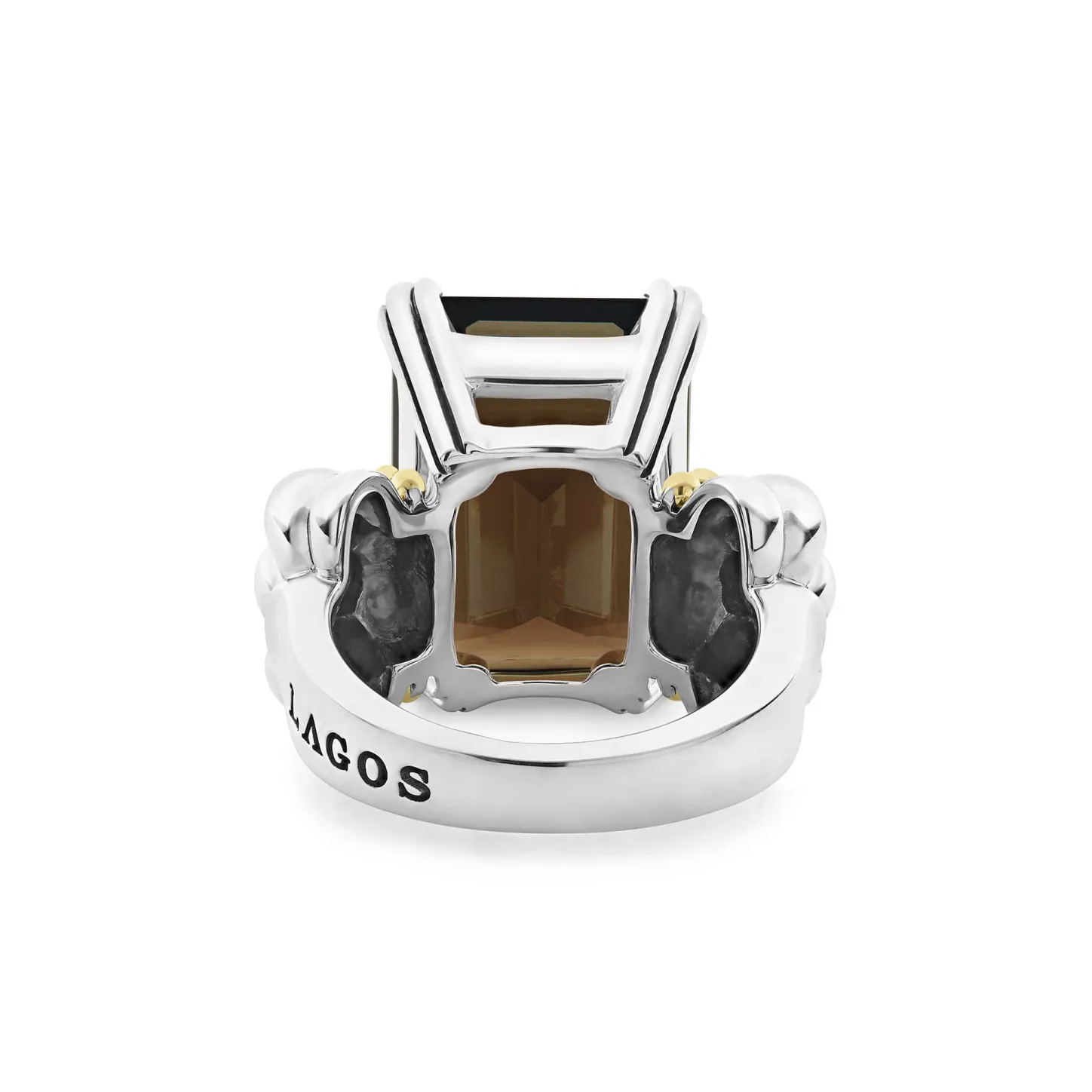 The Return Of A Lagos Icon. Our Signature Emerald-Cut Smokey Quartz Ring With A Prong Setting In Sterling Silver And 18K Gold Caviar Beading.