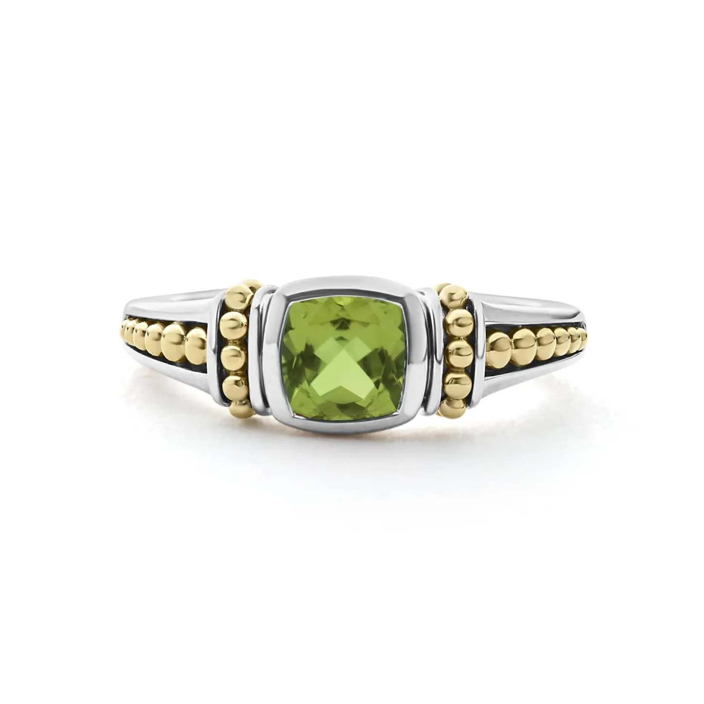 Peridot Gemstone Ring Surrounded By Sterling Silver And 18K Gold Caviar Beading.