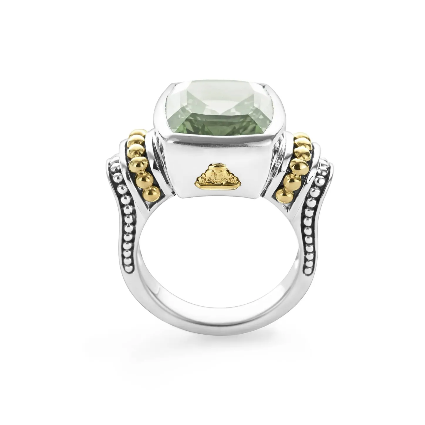 Prasiolite Bezel-Set Gemstone Ring With 18K Gold Caviar Beading On A Sterling Silver Band.
