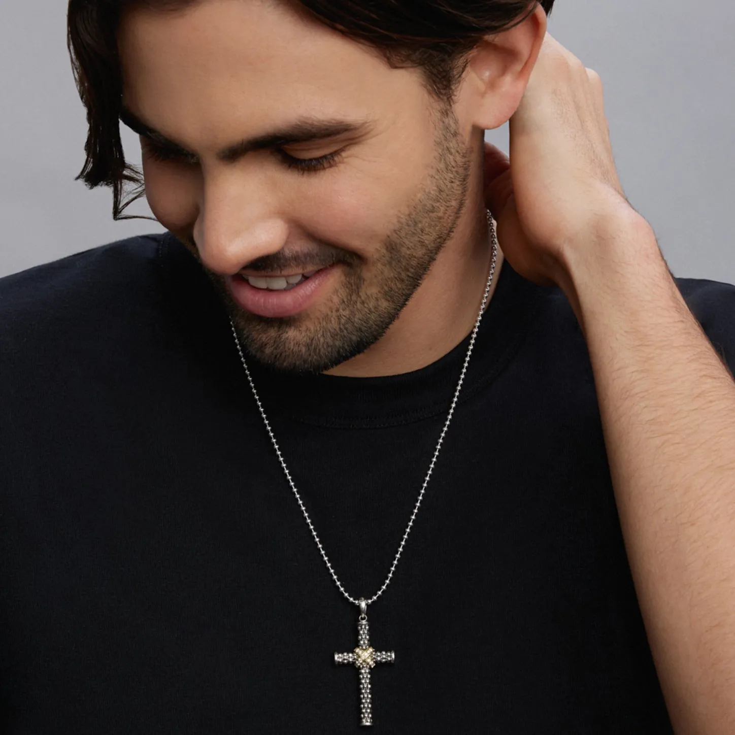18K Gold And Diamonds Surrounded By Smooth Sterling Silver Caviar Beading Form This Two Tone Cross Amulet.