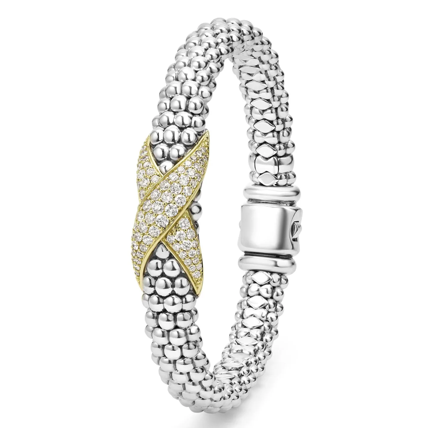 Smooth 18K Gold, Diamonds, And Sterling Silver Caviar Beading Form This X Station Bracelet. Lagos Diamonds Are The Highest Quality Natural Stones.
