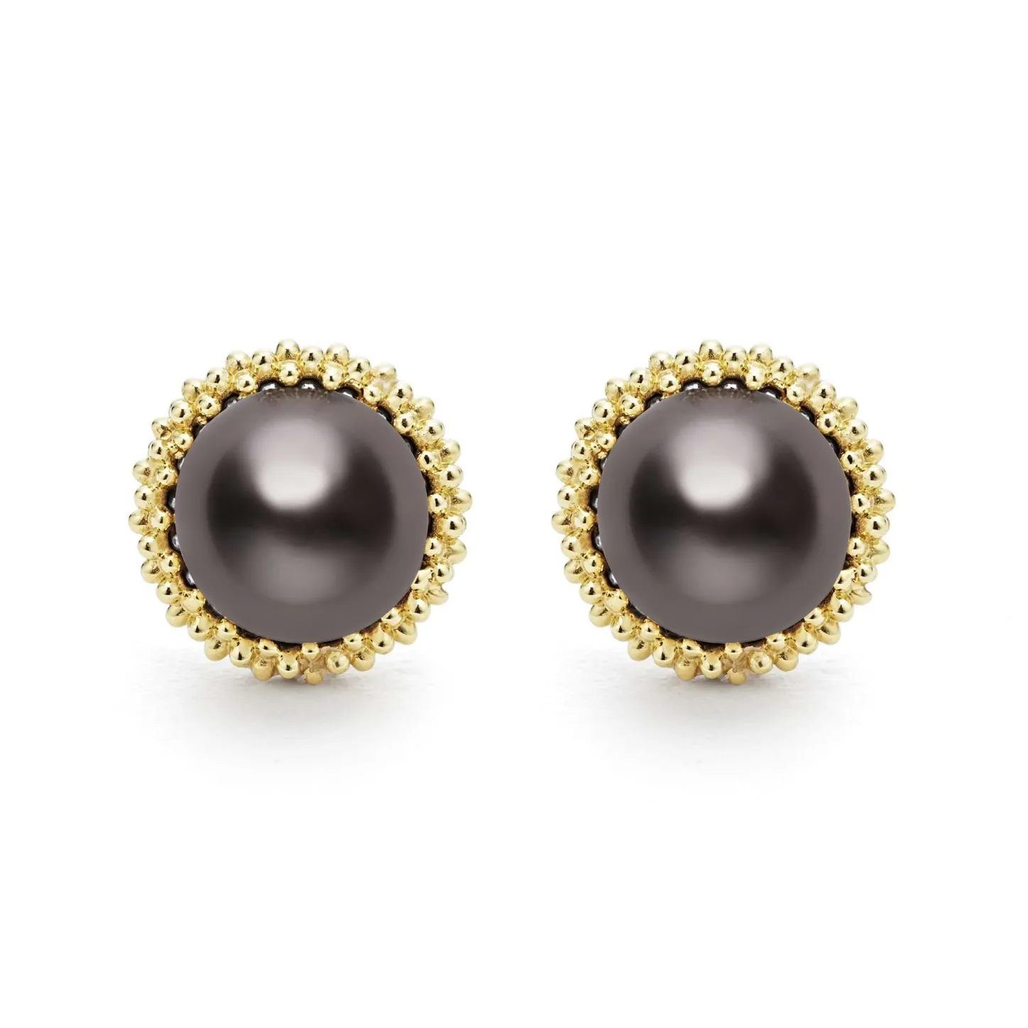 A Tahitian Black Pearl Stud Earrings Set In 18K Gold Caviar Beading. Just The Right Touch For Every Day.