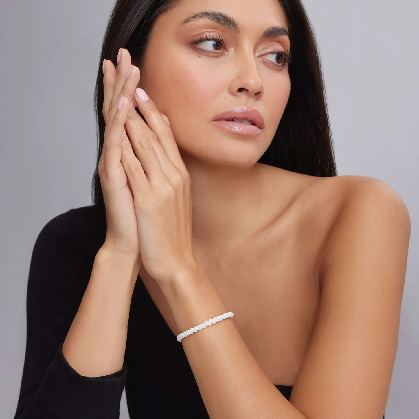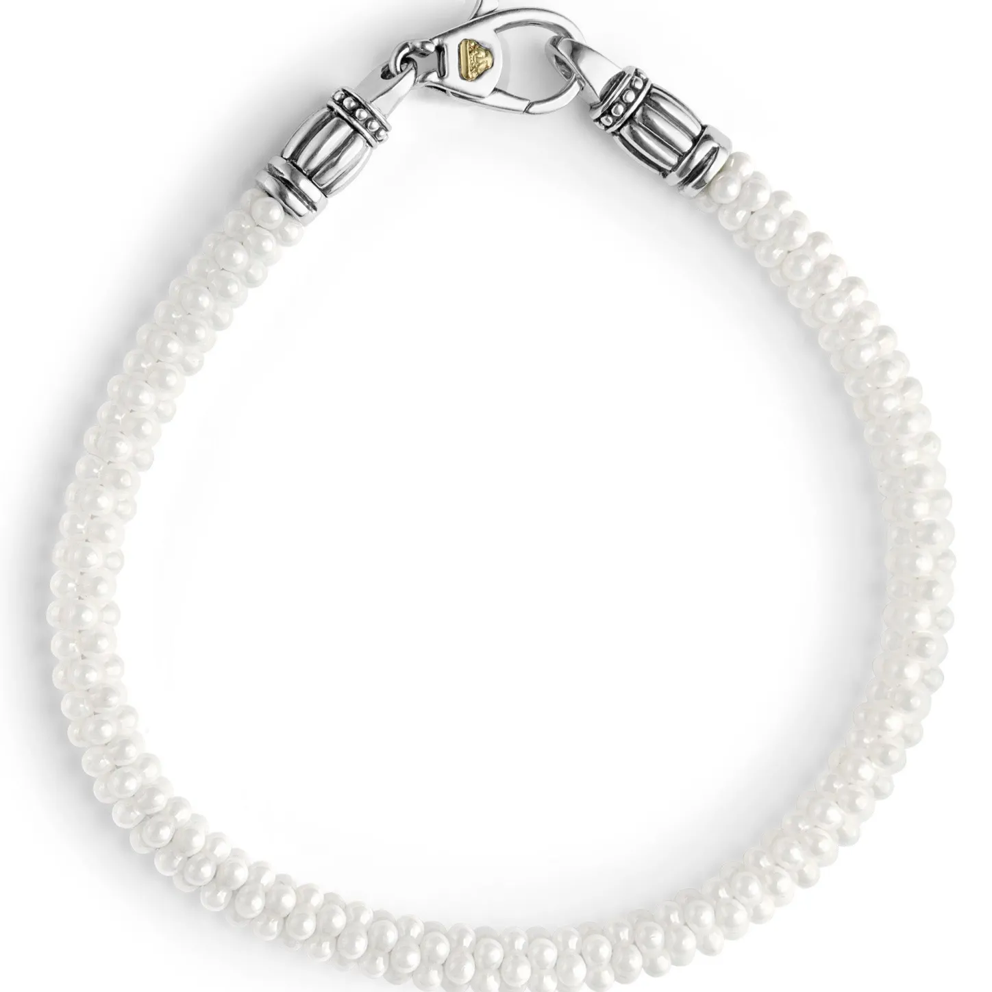 A White Ceramic Caviar Bracelet That Is Finished With A Sterling Silver Lobster Clasp Detailing An 18K Gold Lagos Crest.