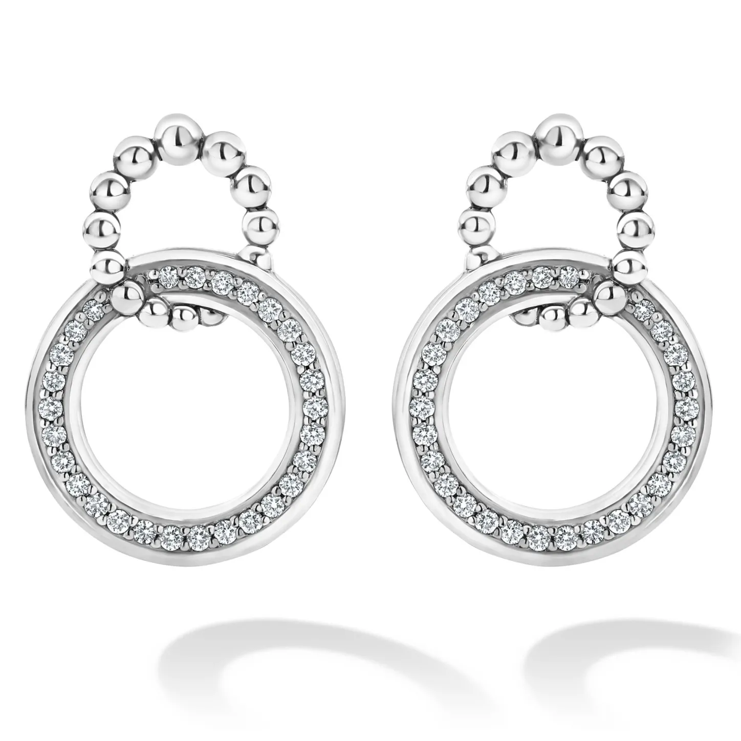 A Diamond Circle Interlocks With A Caviar Beaded Circle To Form Each Earring Of This Set. Lagos Diamonds Are The Highest Quality Natural Stones.
