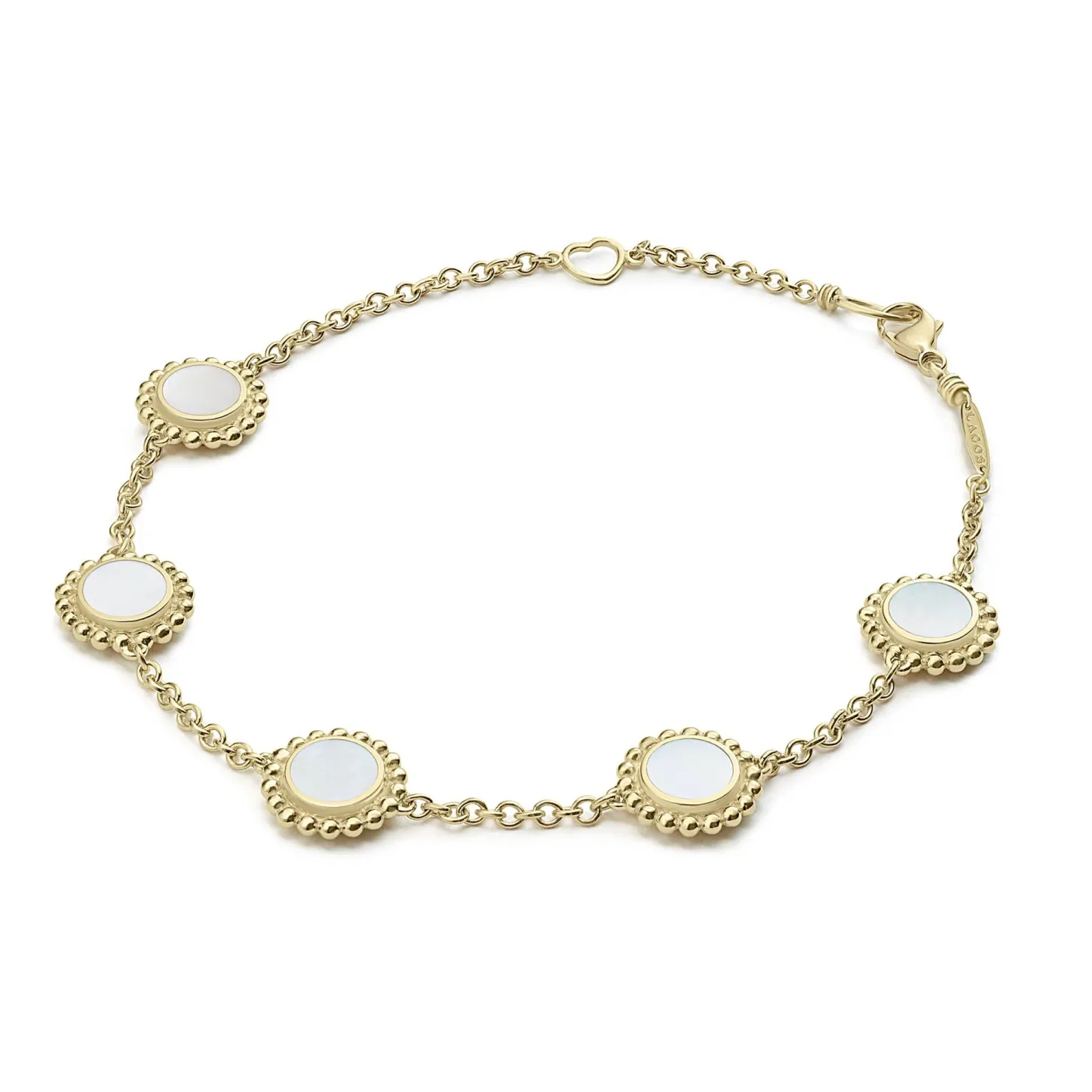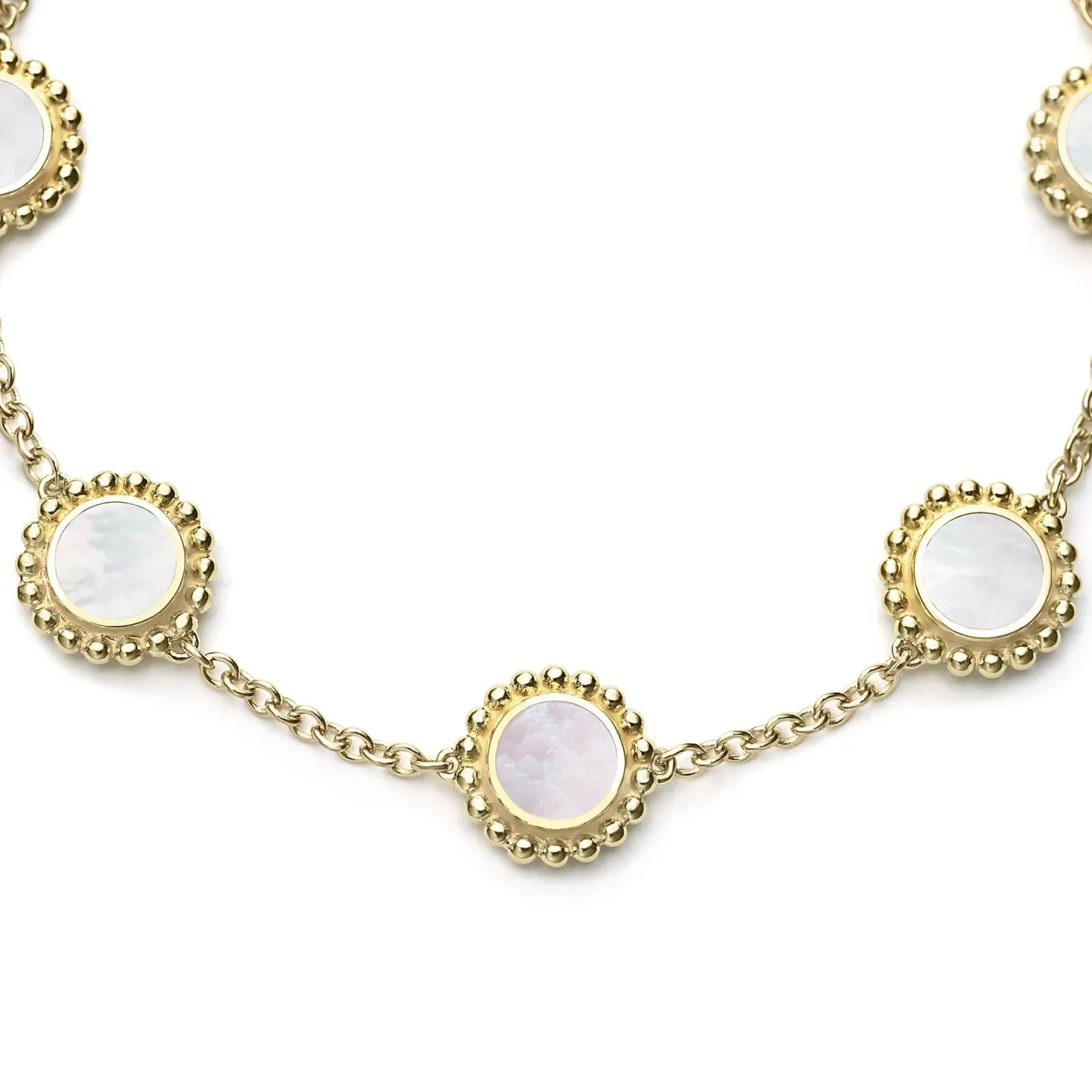 An 18K Gold Bracelet Including Five Mother Of Pearl Inlay Stations With Caviar Beaded Details.
