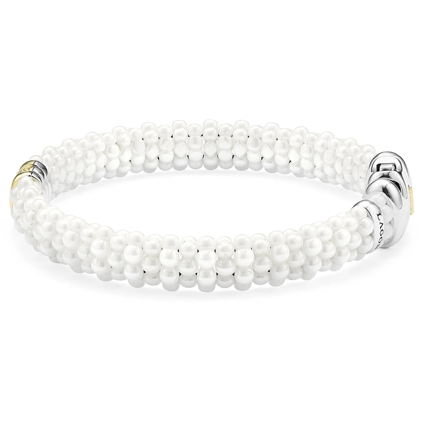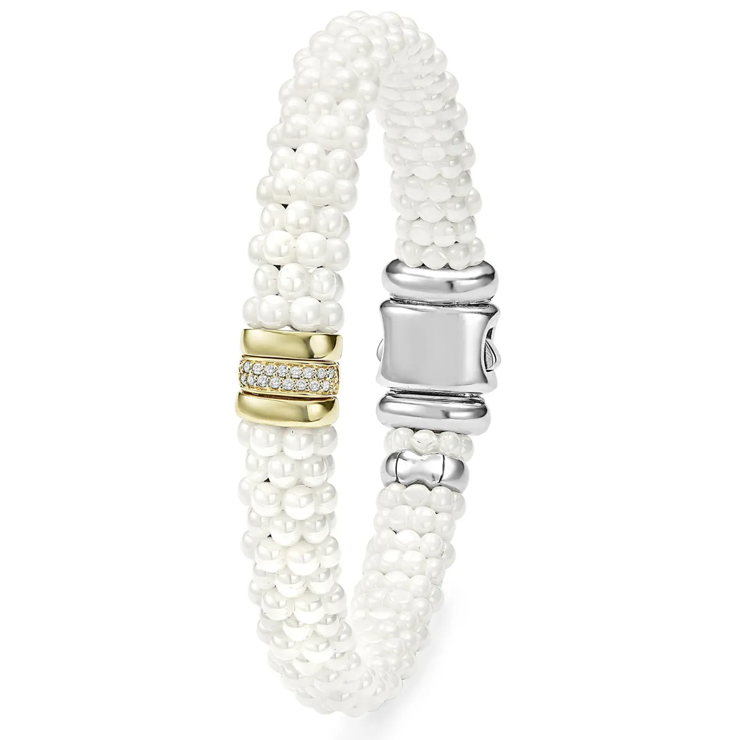 White Caviar Beaded Ceramic Bracelet With 18K Gold And One Diamond Station. Lagos Diamonds Are The Highest Quality Natural Stones.
