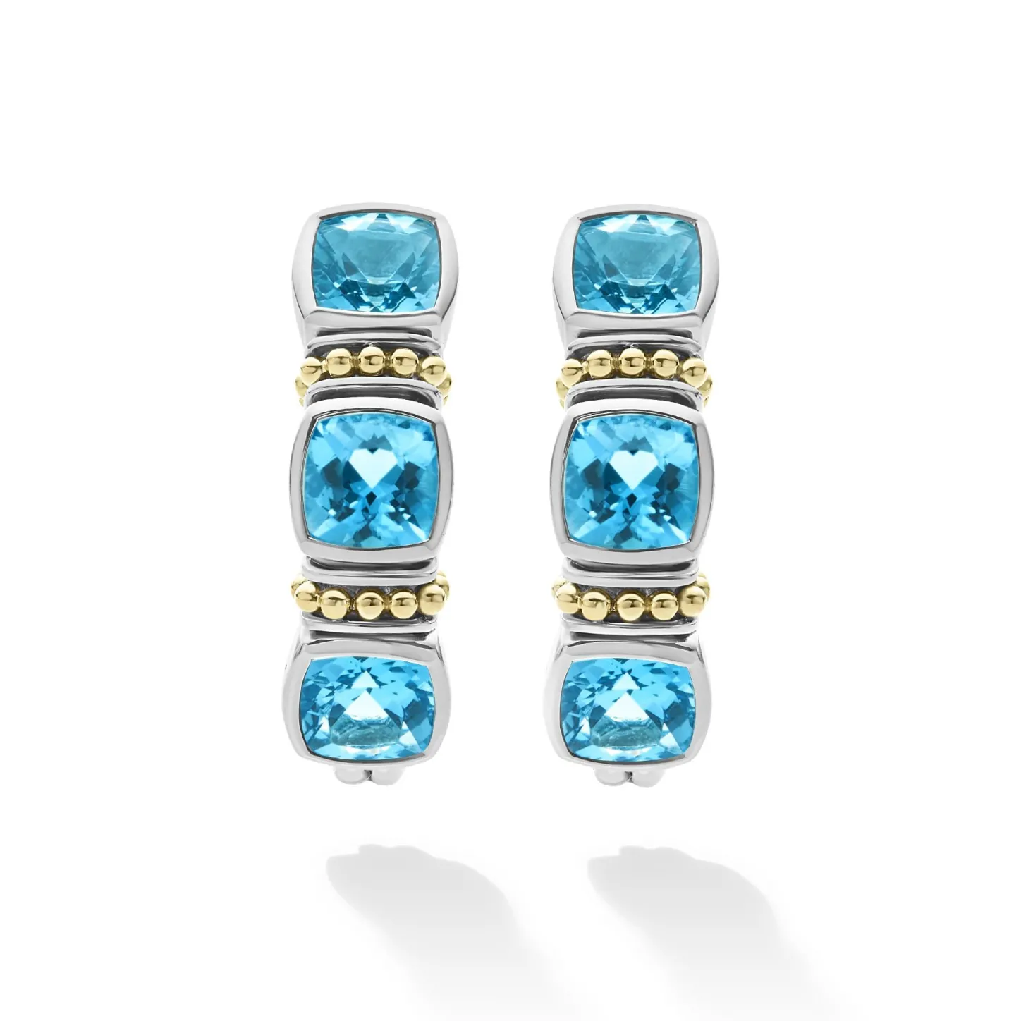 Swiss Blue Topaz Gemstone Hoop Earrings Surrounded By Sterling Silver And 18K Gold Caviar Beading.