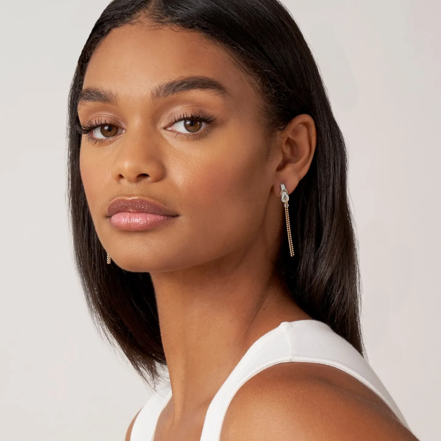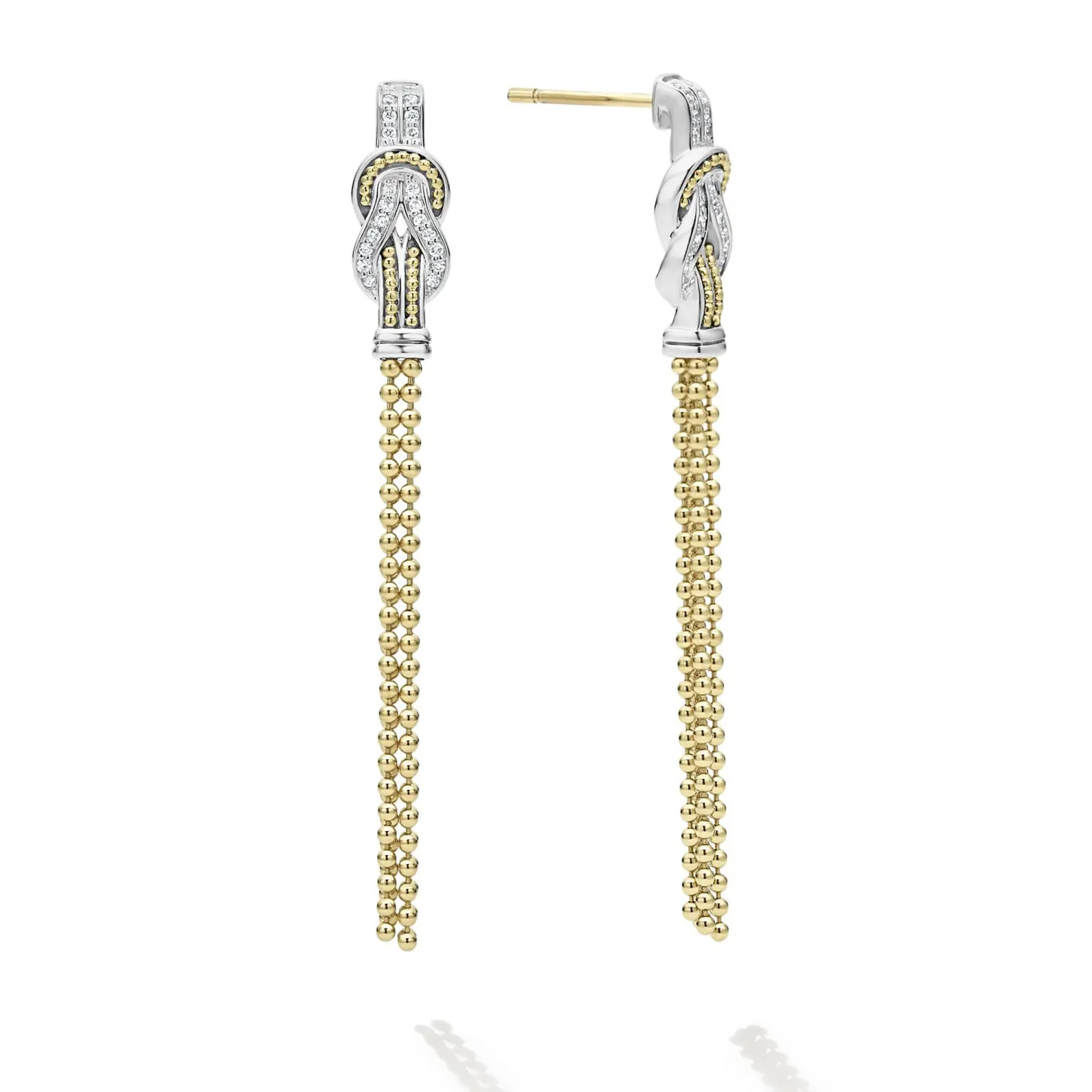 Diamonds And 18K Gold Woven In A Knot Motif Form These Unique Newport Stud Earrings Accented With A Gold Caviar Drop Tassel. Lagos Diamonds Are The Highest Quality Natural Stones.