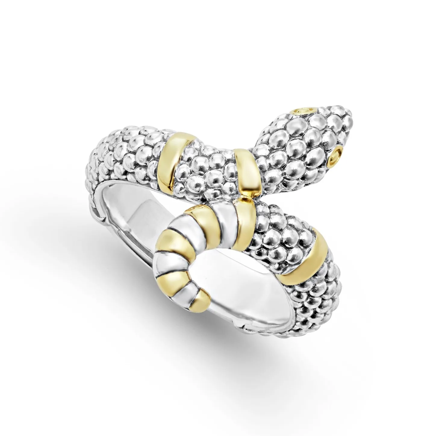Sterling Silver Caviar Beading Highlighted By 18K Gold Stations Form This Unique Snake Ring.