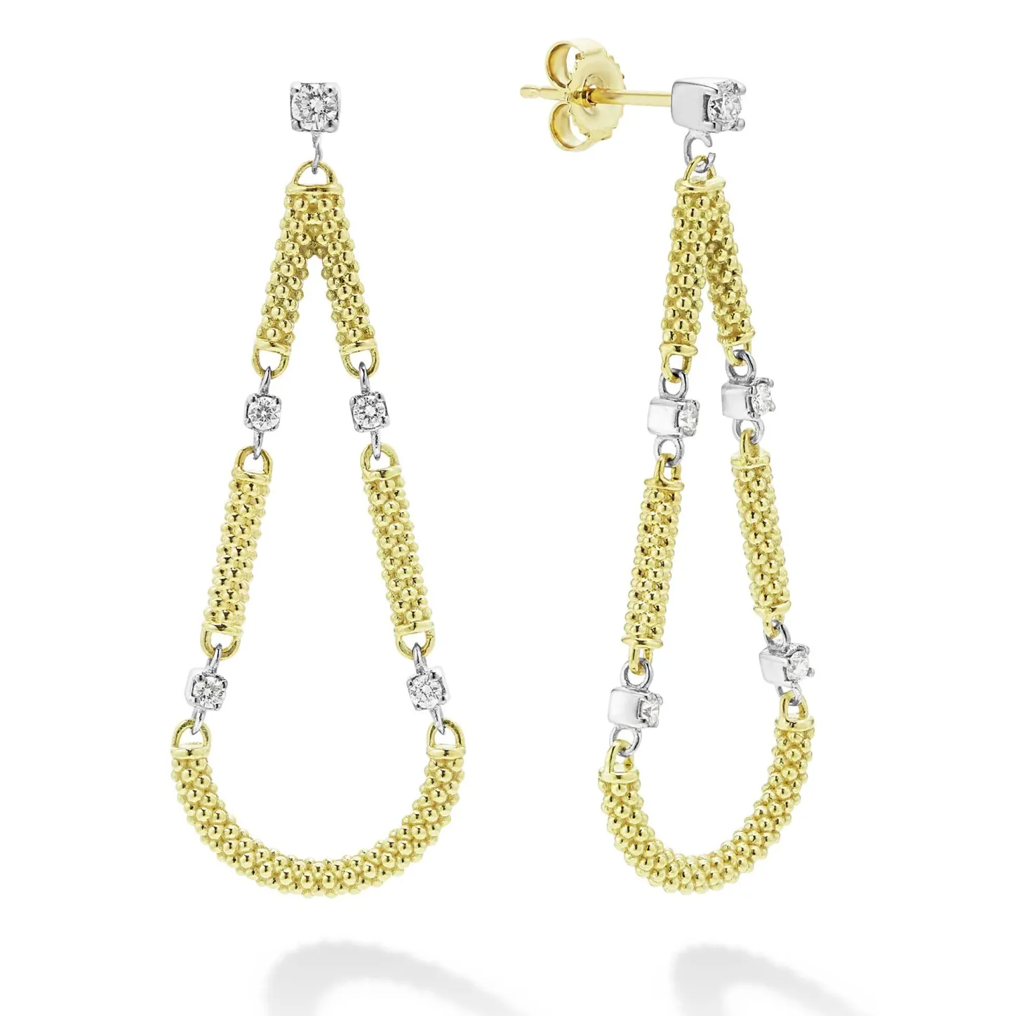 Diamonds Accented With 18K Gold Superfine Caviar Beading Form These Dramatic Drop Earrings. Lagos Diamonds Are The Highest Quality Natural Stones.