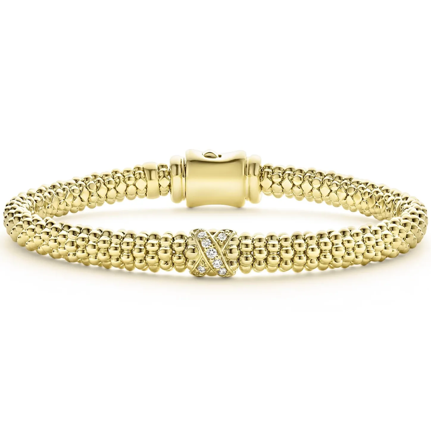 An 18K Gold Diamond X Station Wraps This Caviar Beaded Bracelet. Lagos Diamonds Are The Highest Quality Natural Stones.